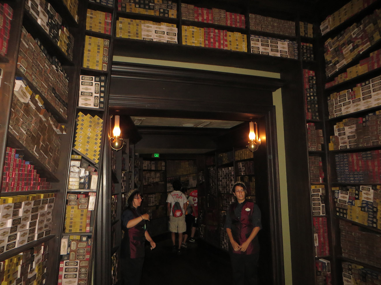 Once at Universal, Robert and I got park to park tickets, which let you enter both Universal and Islands of Adventure. Why? Well, you'll see in a bit... The first new thing I saw after entering the park was a Despicable Me ride. There was a new Transformers ride as well, though we decided to save both of them for later and focus on Diagon Alley in hopes of beating the crowds. At first, the Diagon Alley area is set up like an ordinary London street, though fans will spot a few familiar buildings and a couple of magical oddities before ducking behind a building and passing through a hole in the wall into Diagon Alley proper. Unlike Hogsmeade, Diagon Alley is entirely walled off from the rest of the park, blocking out views of the other areas and making it even easier to feel like you've stepped into Harry's world. Here I am on one of the main streets. While I love Hogsmeade, I have to say that, in many ways, Diagon Alley surpasses it. Fans of the books and/or movies will spot recognizable shops everywhere they look. If there's a Diagon Alley store, restaurant, or other building named in the books, you'll find it here and, in most cases, can go inside and take a look. After getting some butterbeer, Robert and I spent quite a while just wandering around, exploring the buildings, and pointing out all the familiar places and items to be found. And it's not just Diagon Alley, Nocturne Alley is there as well (dark, cool, and spooky), complete with a certain famous shop for items related to the darker side of magic. And throughout the entire area you'll find a number of costumed employees roaming about, further enhancing the atmosphere.