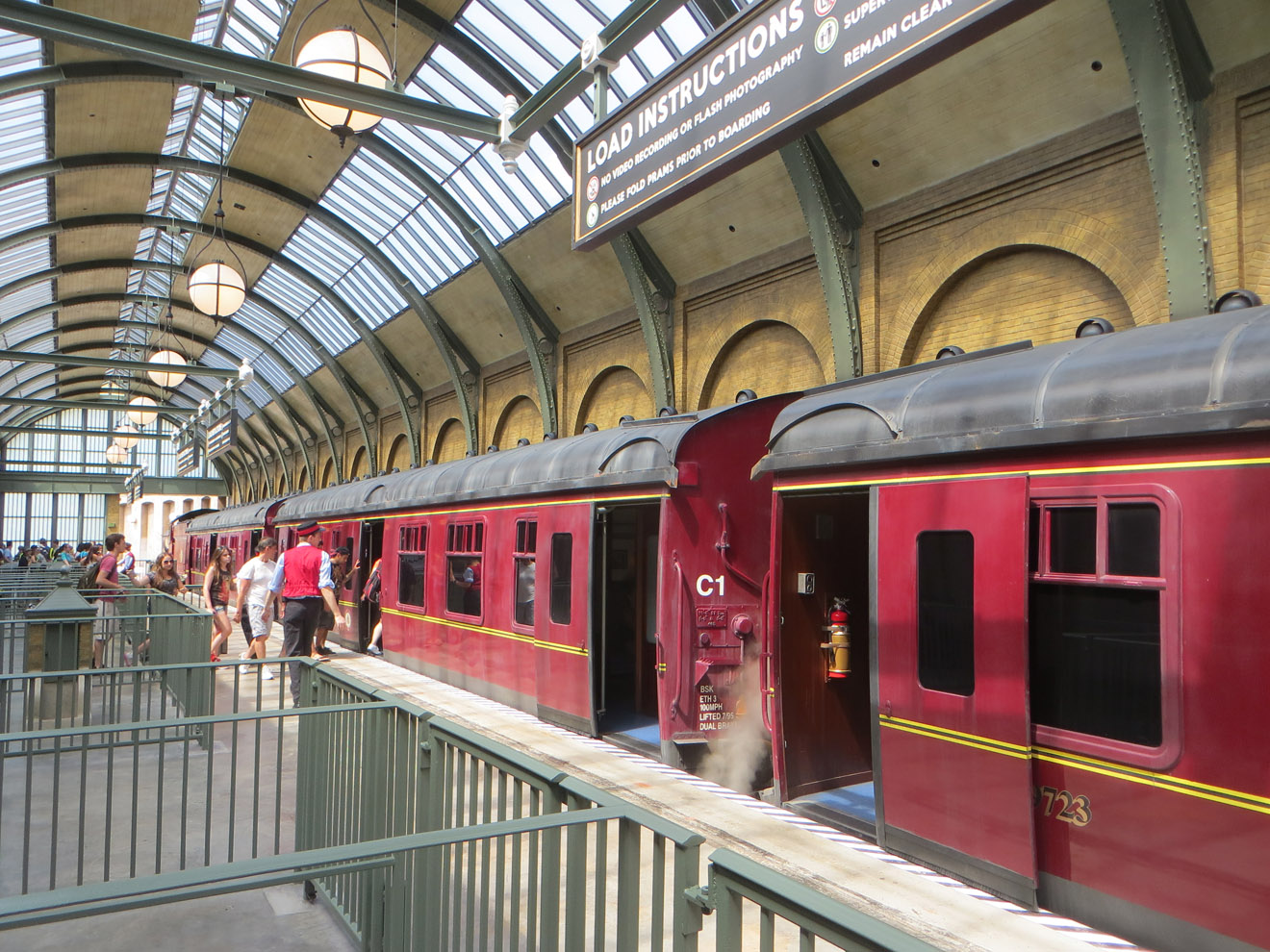 After eating, we checked for the line for the Gringott's mine cart ride, which was sporting a massive 2 1/2 hour wait. That was a bit better than the three hours it was when we first passed, but still really long. So we decided to head to the area's other ride. The Hogwarts Express is both a ride and a convenient way of going between Diagon Alley and Hogsmeade. However, you need a ticket with park to park access in order to ride it. That makes for a clever way for Universal to sell more of those tickets (which naturally cost more), but it also helps keep the line down. To get on the Hogwarts Express, you first have to leave Diagon Alley and make your way through a recreation of King's Cross station. Eventually, of course, you pass through to Platform 9 3/4 and find the Hogwarts Express. It's a fairly simple train ride, but the windows have been replaced with screens, displaying the appropriate countryside (and the occasional wizard or magical beast) as your journey progresses. Meanwhile, you can see silhouettes and hear voices of the students as they walk past your cabin, including Harry, Ron, and Hermione. It's really cool and it actually changes depending on which direction you're going, making it worth riding at least twice.
