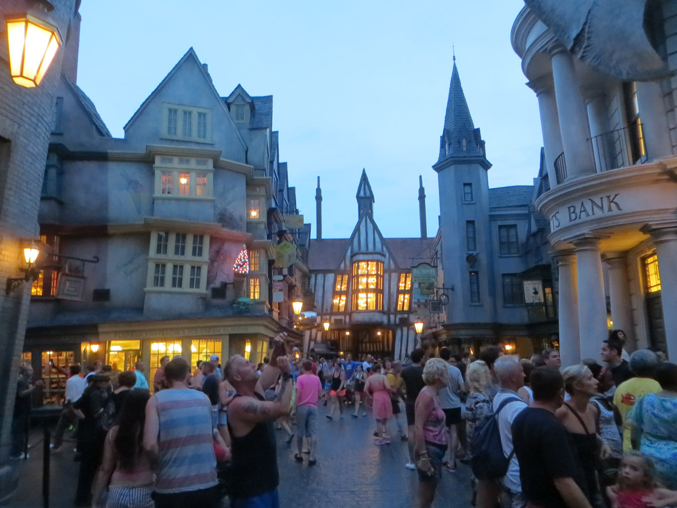 Back in Universal, we spent a bit of time taking in Diagon Alley as it got dark and stopped to watch a performance from Celestina Warbeck, the singing sorceress, which was quite entertaining. Unfortunately, we finally had to give up on Gringotts. That was disappointing, but I'm sure I'll be back someday, when I'll definitely make a point of riding it. Instead, we finished up the day with the Despicable Me ride, which is a 3D movie combined with seats that tilt and shake. Not bad, but not especially amazing either.