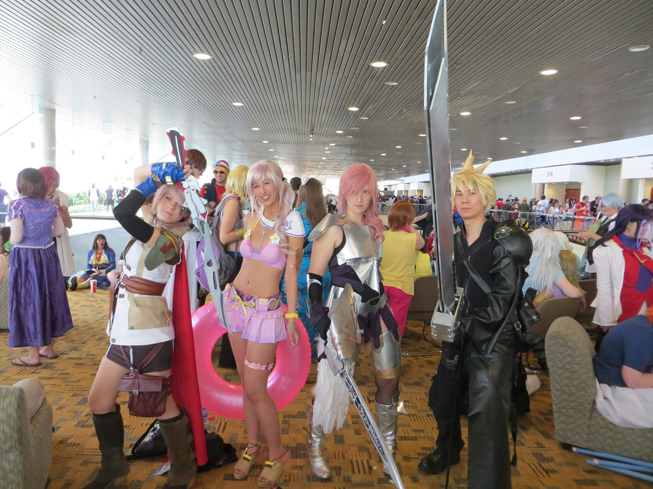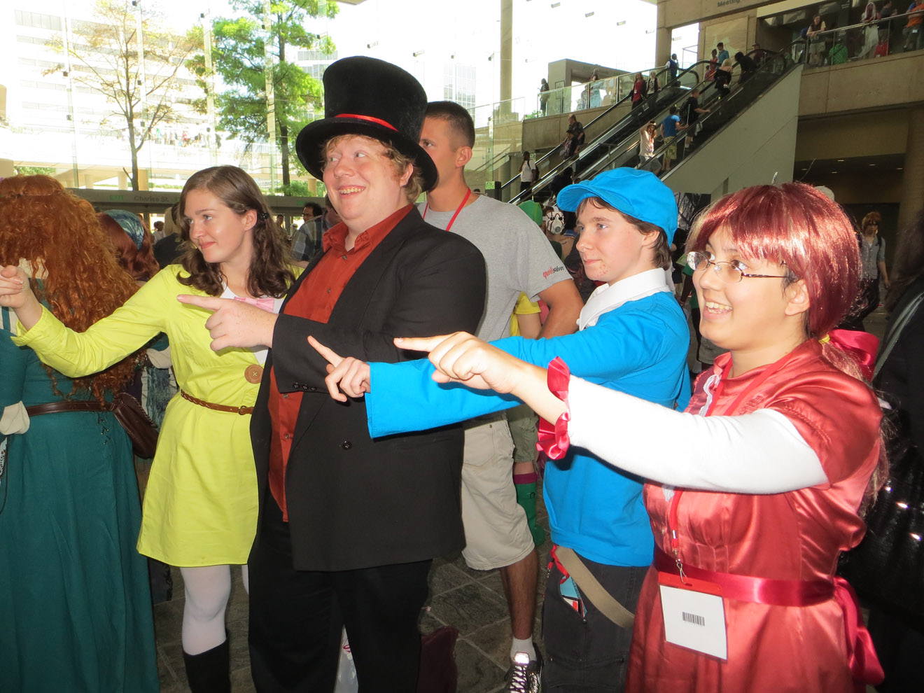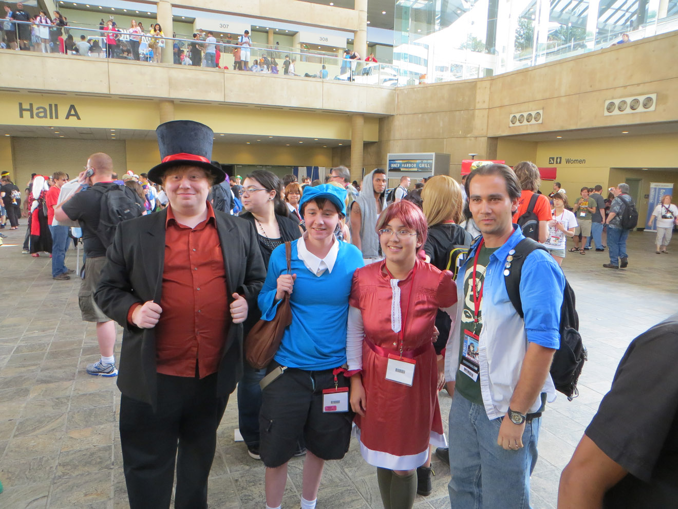 So what did I do? Well, first off, I met up with forum members Stevenson, Silver, and Colly (from left to right). I've known them all for a long time online (around nine year's, in Silver's case) but this was our first time meeting in person. It was a little awkward at first, but they were pretty much how I pictured them and we ended up hanging out together for most of the con and had a lot of fun. It's too bad we don't live closer to each other. As a side note, I know I look a little odd in the photo, but the guy who had my camera wasn't so great with timing, while the guy with Silver and Colly's camera wasn't so good at focusing...so we've got two rather imperfect photos. You can probably tell by the photo that they have a Professor Layton cosplay theme going on, so here's a group photo with the addition of Stevenson's girlfriend as Emmy to complete the set. As you can likely tell, I didn't cosplay. I think it would be fun to try, but I'd need a lot of time before hand to prepare a good costume. But hey, I'm wearing one of those shirts I got in Tokyo, so that should count for something, right?