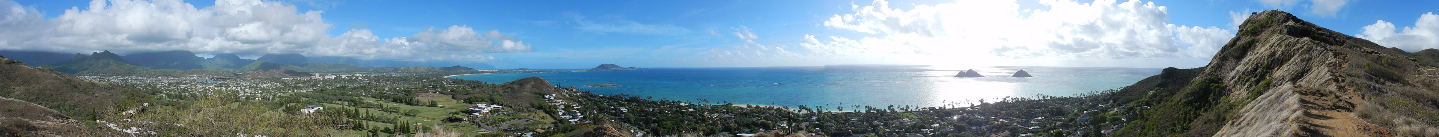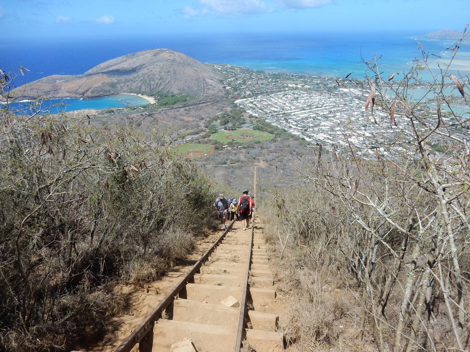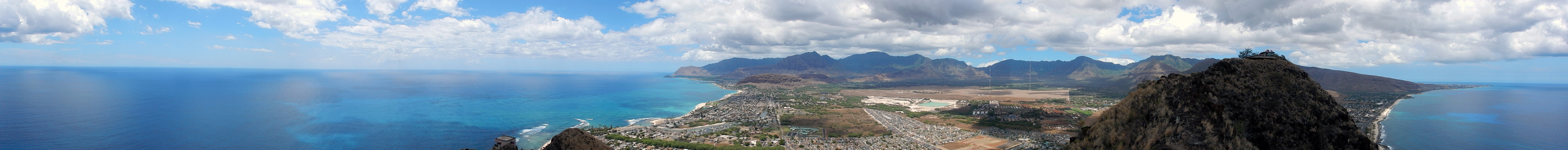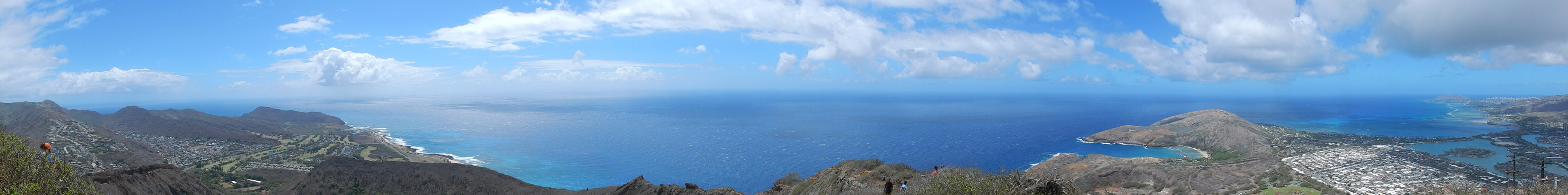 In the end, we reached the same place the regular Koko Head hike ends. Here's a panorama from the top and here's a close up of Hawaii Kai and Honolulu. From there it was a quick and simple walk down the regular railway trail back to the parking lot. Between the coastline and the arch climb, I'd say this is one of my favorite hikes on the island (at least so far). But, while it's not especially dangerous, you do need to be careful climbing over the arch and pay attention to the tides if you walk along the coast.