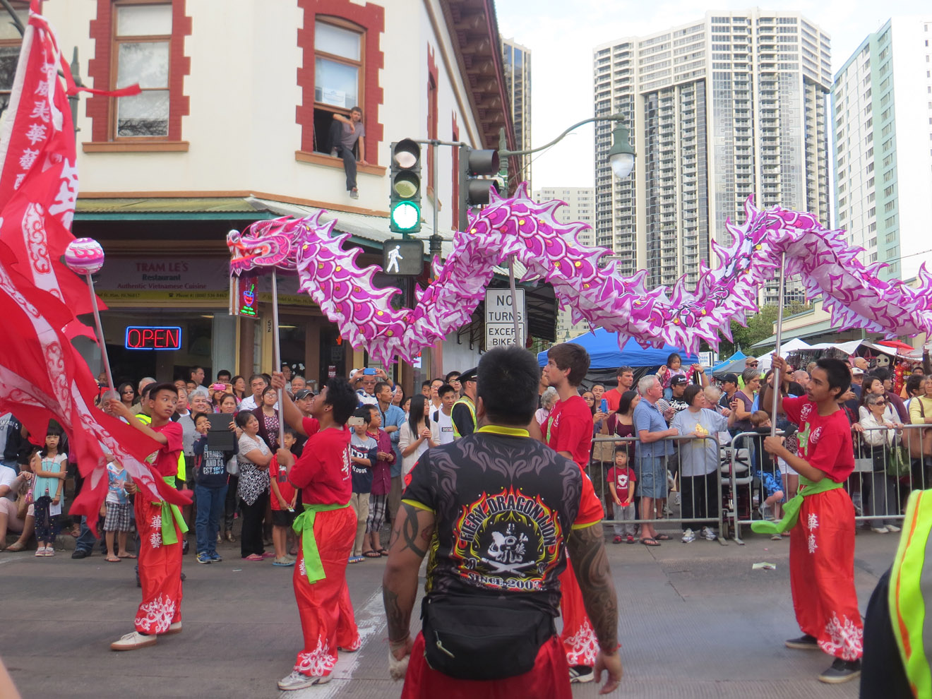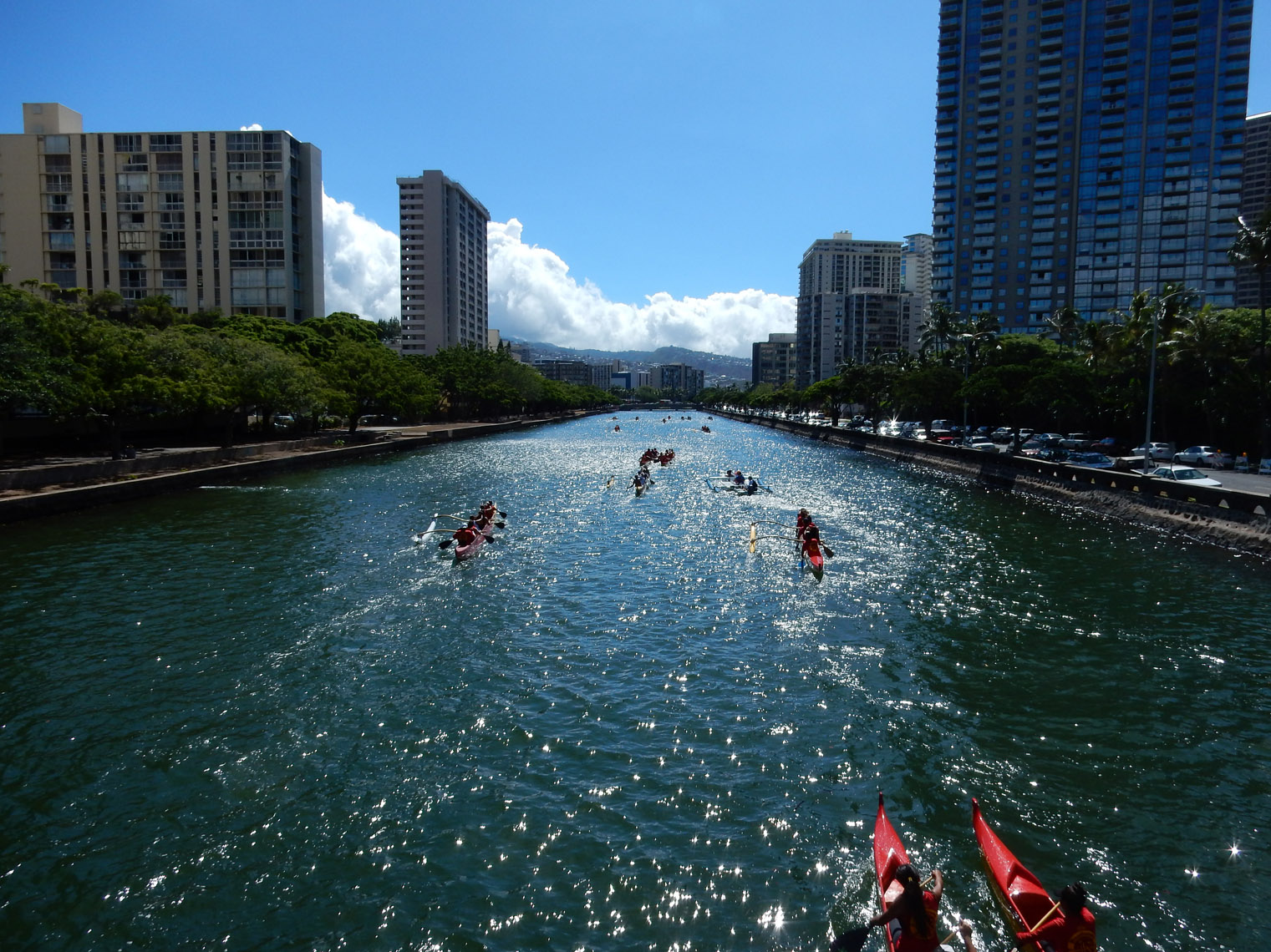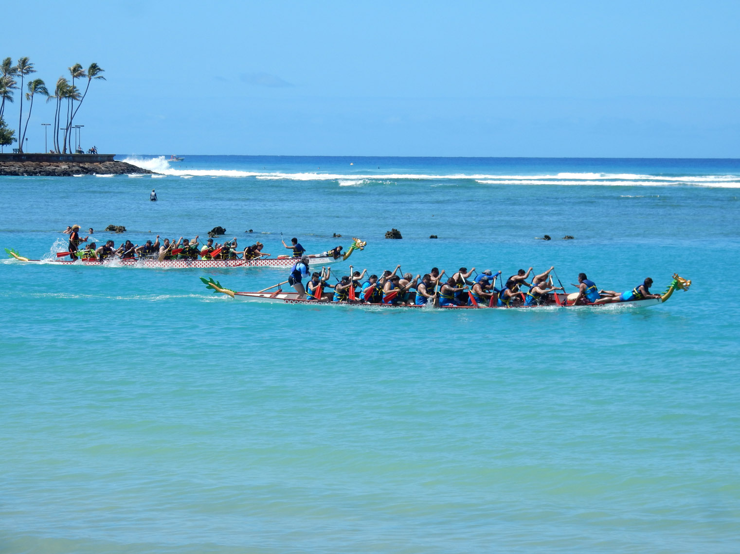 My other weekend activity, besides some beach time, was checking out the dragon boat races Saturday morning. While you see a lot of long kayaks on Honolulu's main canal, dragon boats are different. They're Chinese in origin and they have dragon head and tail designs. More practically though, they have two rows of rowers and a drummer to help them keep time (like the old ships used to have). There's also a person laying on the front whose job it is to grab a flag at the end of the race. Now this is what I thought the Dragon Boat Festival in China would have a lot of (I was wrong). Kinda interesting to watch, at least for a bit.