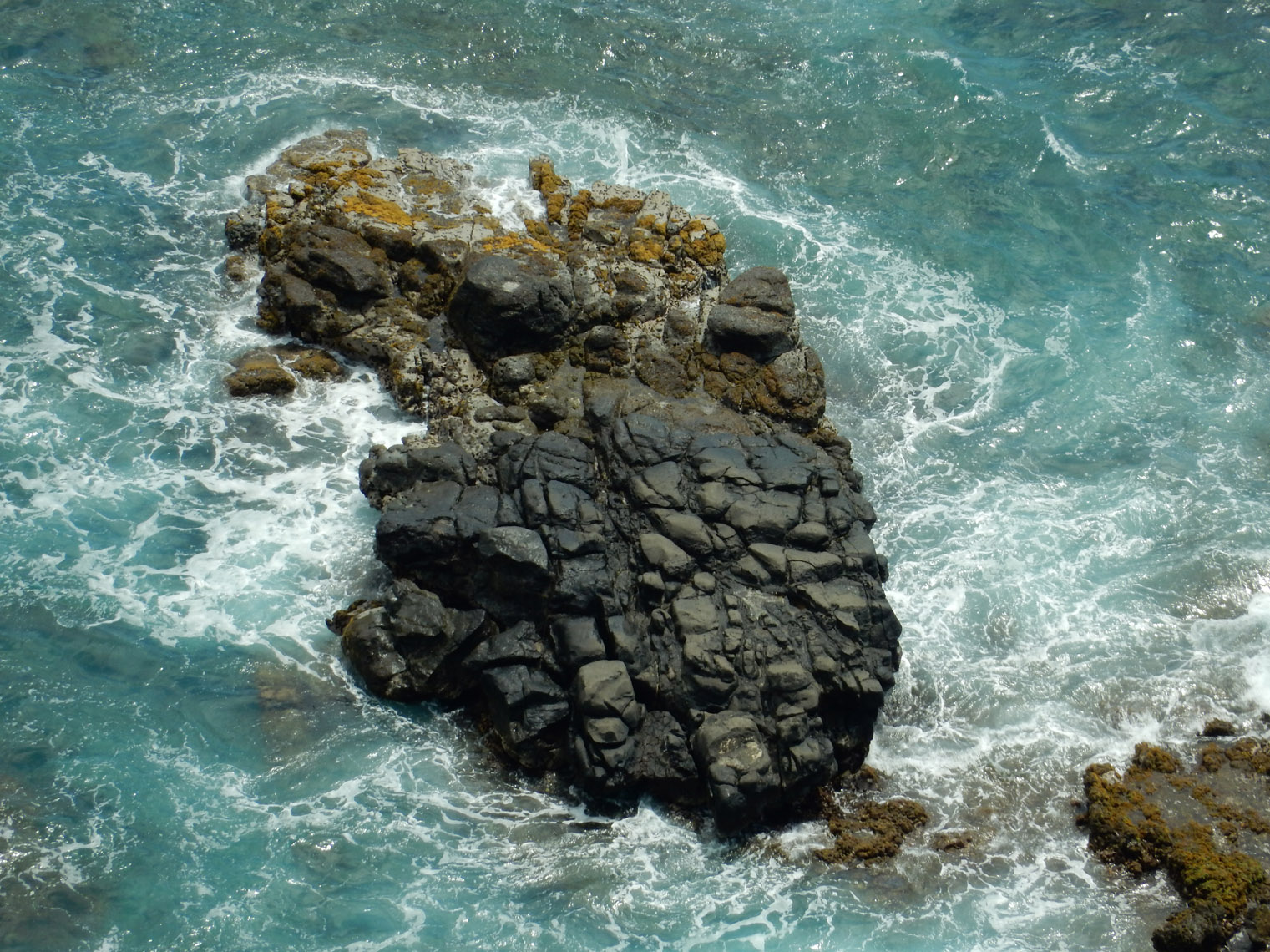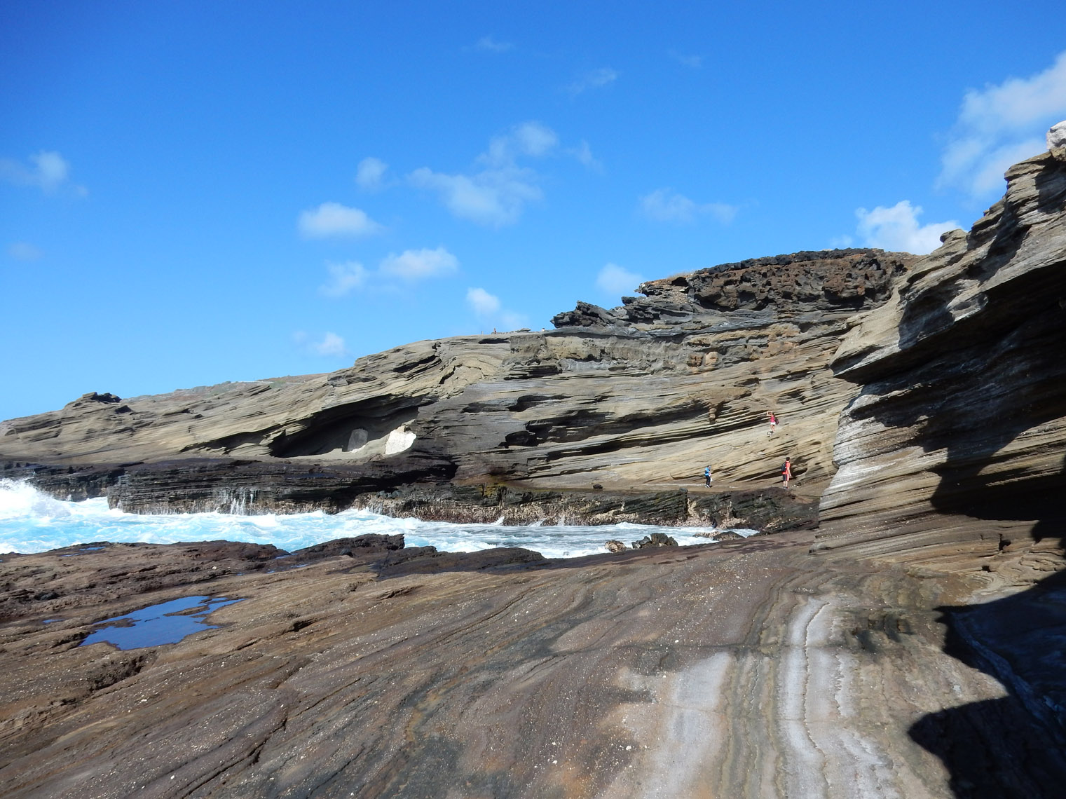 We started at the regular Koko Head parking lot. For one thing, there isn't any parking at the start of the other trail. And that way, we were able to make a loop of it. Avoiding the regular trail, we walked around Koko Head, past the nearby shooting range (for about half the hike, it sounded like we were skirting around a battlefield), and to the road by the coast. Turns out there's actually a small lava tube going under the roadway and out onto the coast. As you can tell from the photo, there's no beach at that area, it's all rocks worn away by long exposure to the waves. It made for an extremely pretty walk, though not one you'd want to take at high tide. The tide was low when we were there, but we still had to watch out for the rare big wave on a couple of narrow sections.