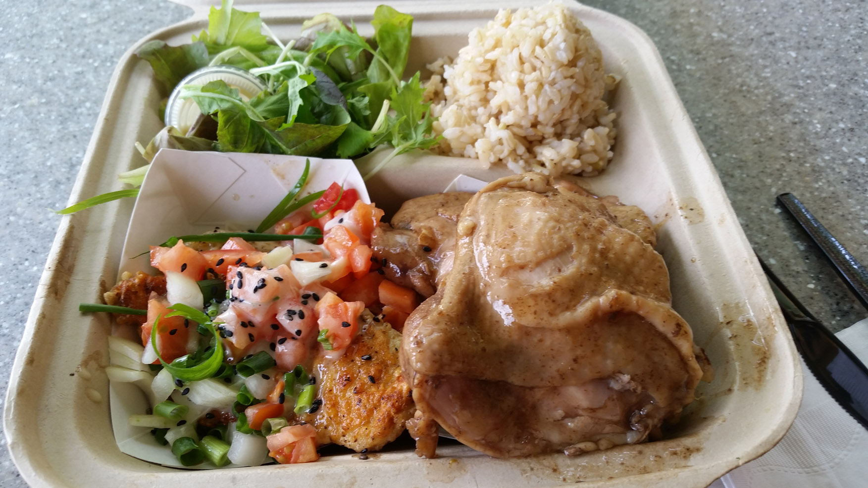 I've had both the loco moco and the potato chip crusted ahi. They're both good, and the portion sizes are generous, but the food lacks that "wow" factor that pushes it from good to great. But you can choose between brown and white rice, which is nice, and most things come with a free side (generally fries or a salad of some kind).