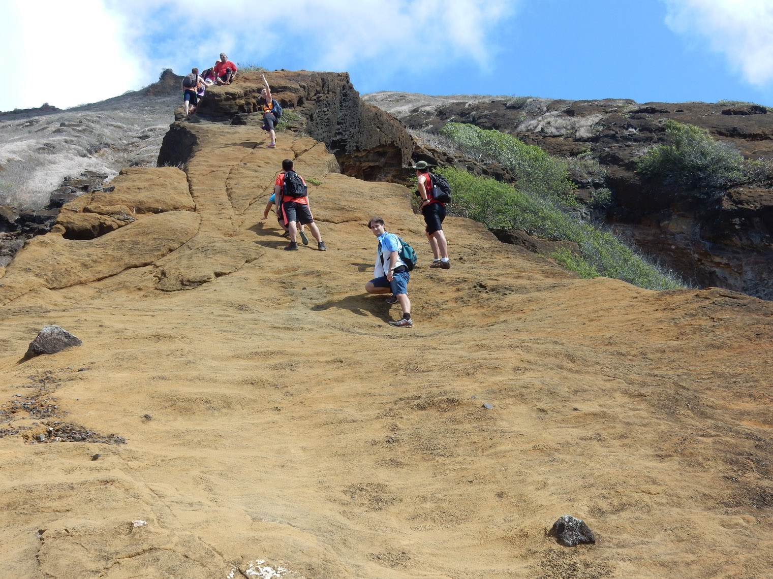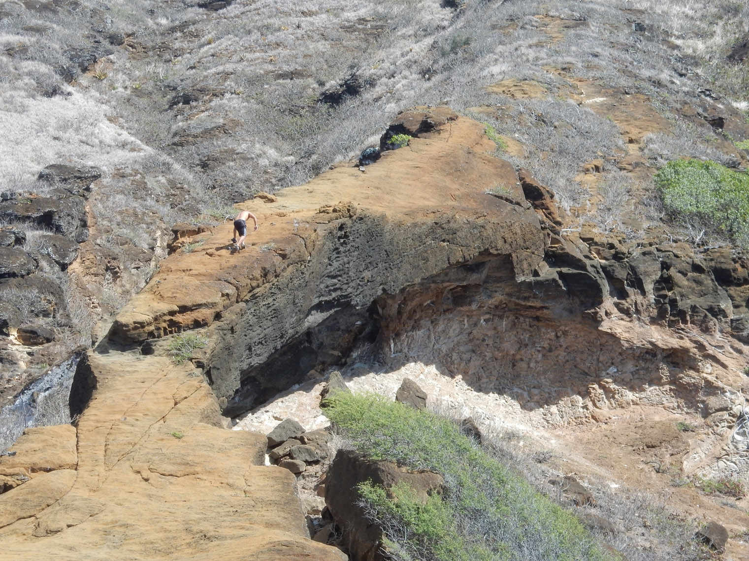 As a note, there was actually no reason we had to walk along the coast like that. It was just more fun and scenic than following the road. And, after a while, we climbed back up and crossed the road to begin our ascent of Koko Head. After a bit of climbing, we neared the arch. Can you see it? Here's a closer shot, but it's still a bit hard to tell that it's an arch from that angle. At that point it went from a hike to more of an actual climb. While it wasn't especially difficult (I've done that kind of thing plenty of times when hiking in Colorado, Utah, and Arizona), I wouldn't recommend it if you're afraid of heights or not in decent physical condition. Here's a panorama I took from on top of the arch.