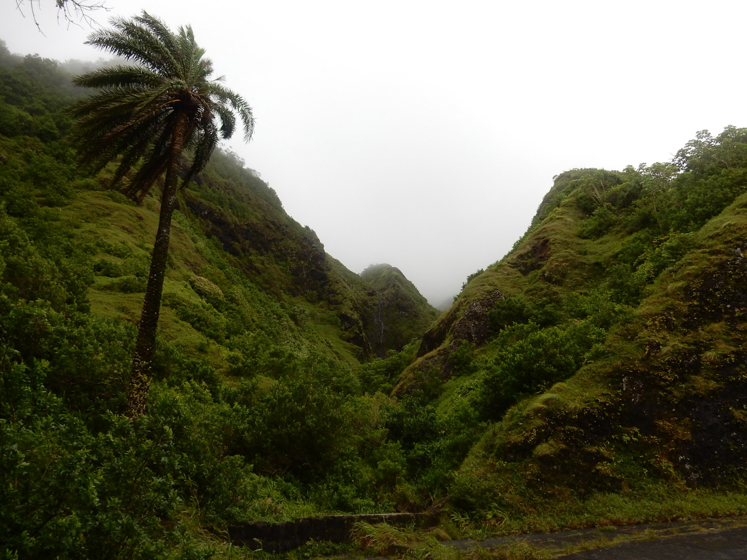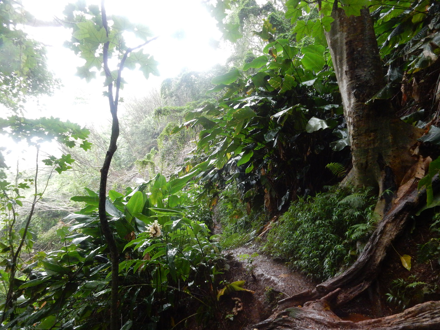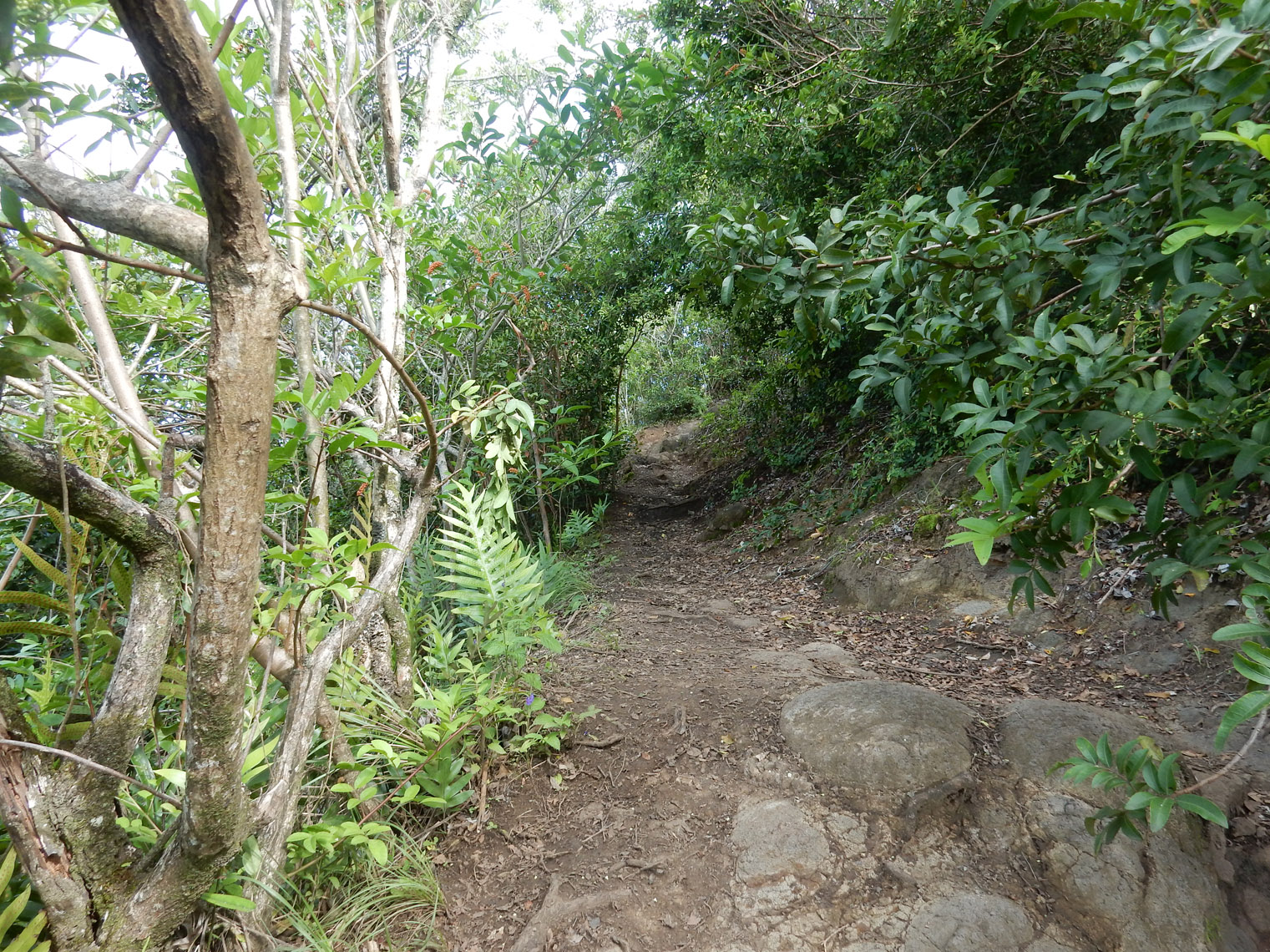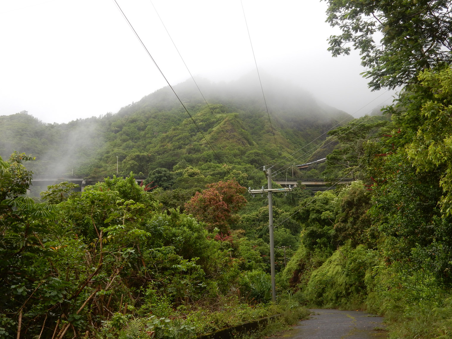 The path starts out going through the forest. It's bound to be a little muddy most of the the time, much more so when it's rainy. Kind of slippery too. After a while though, shortly after the rain stopped, we left the forest behind and ended up on the old Pali Highway. Since being replaced by the newer and wider Pali Highway, it's been closed to traffic and is slowly fading away into the forest, but it's easy to follow and walk on. Speaking of the new Pali, the trail eventually goes underneath it then continues on the old Pali along the side of the mountains and up to the Pali Lookout.