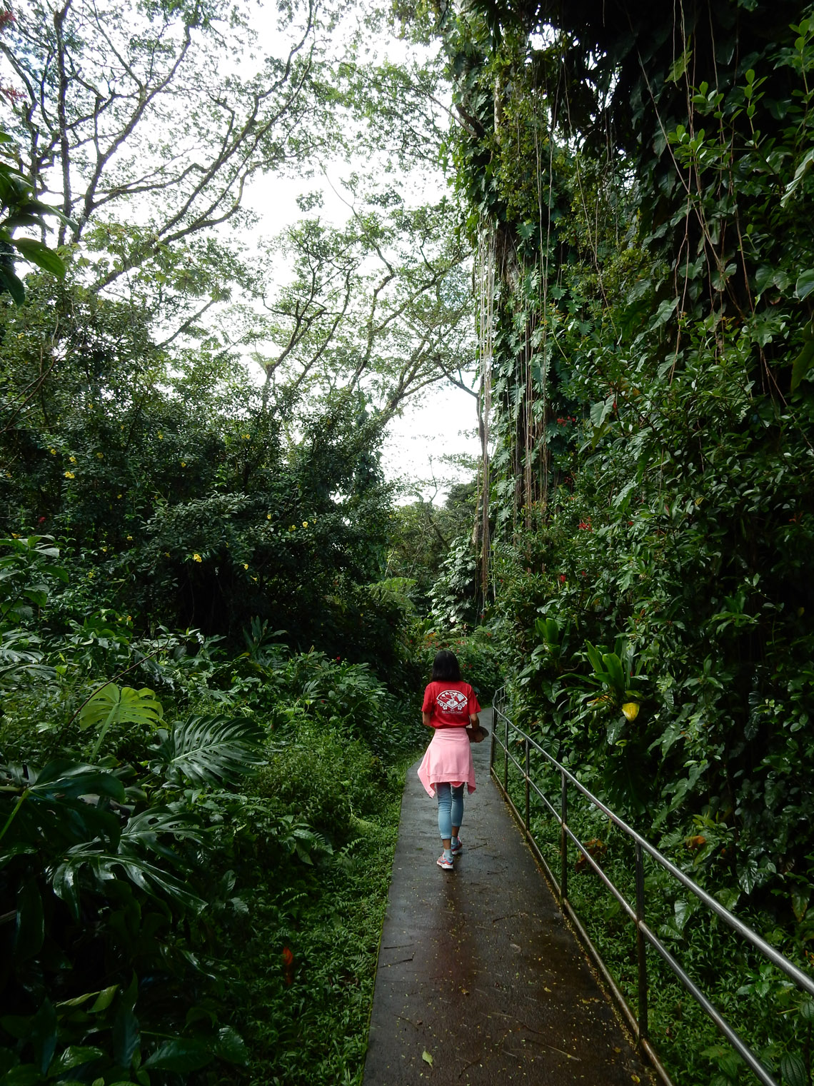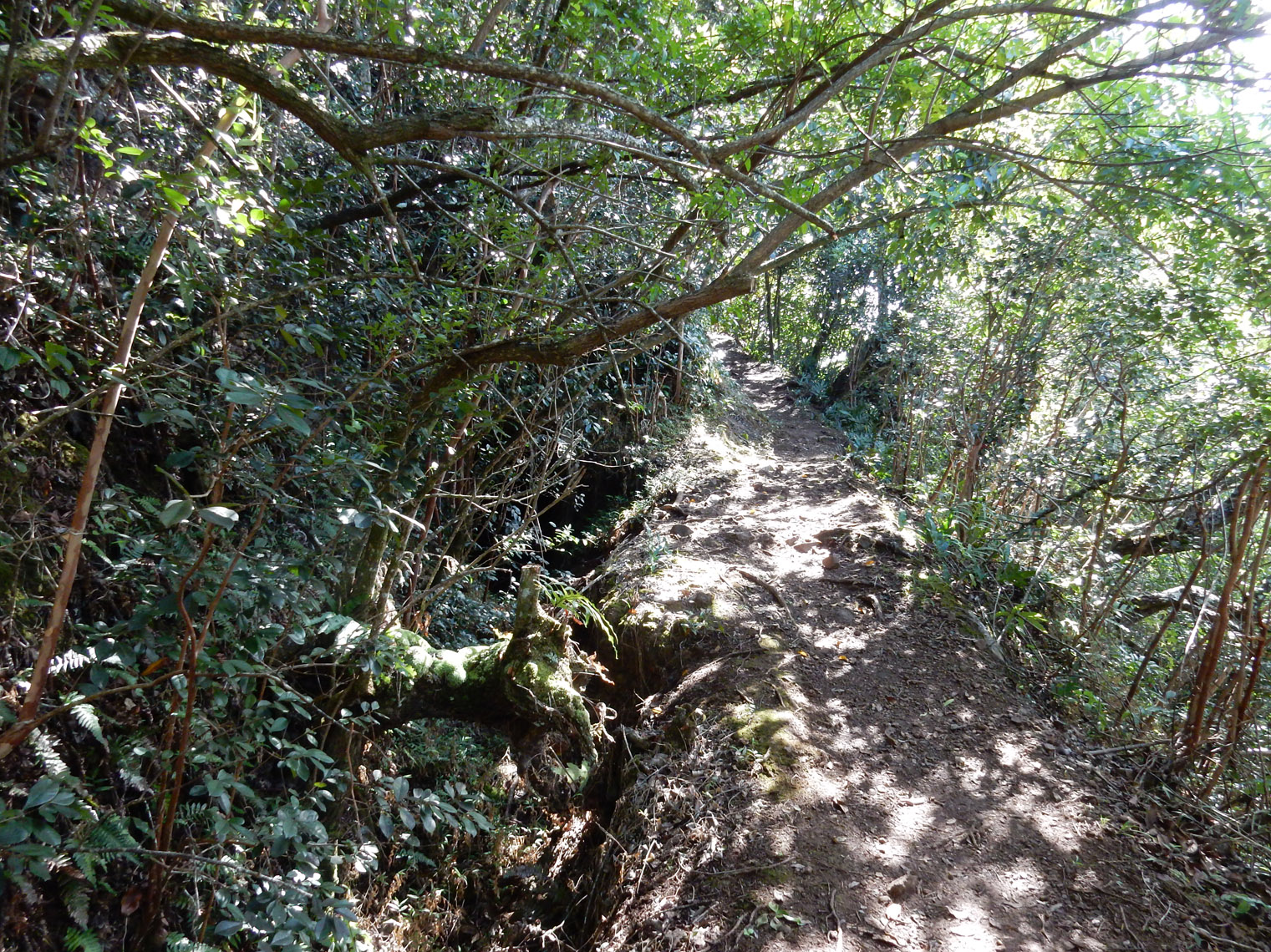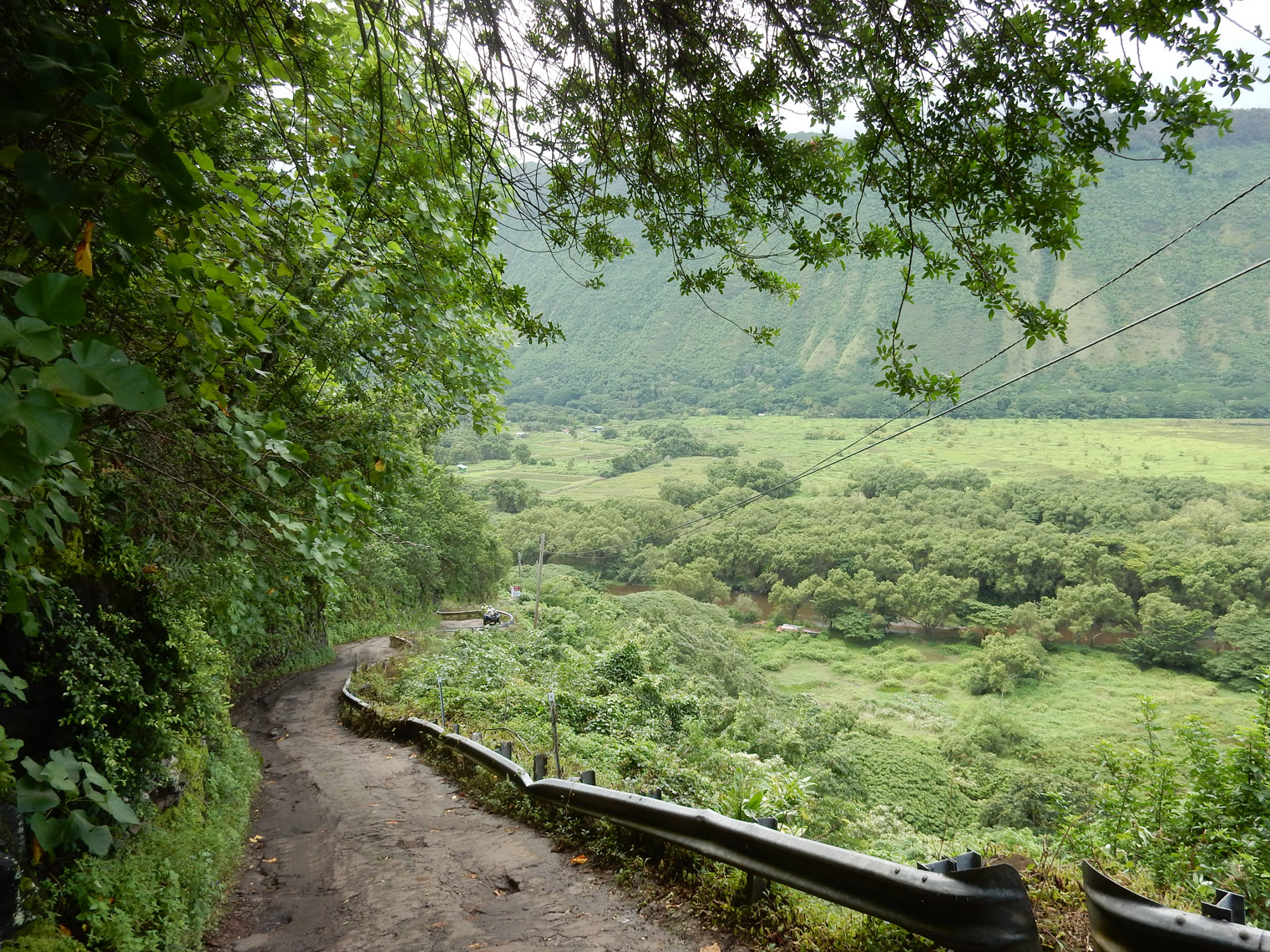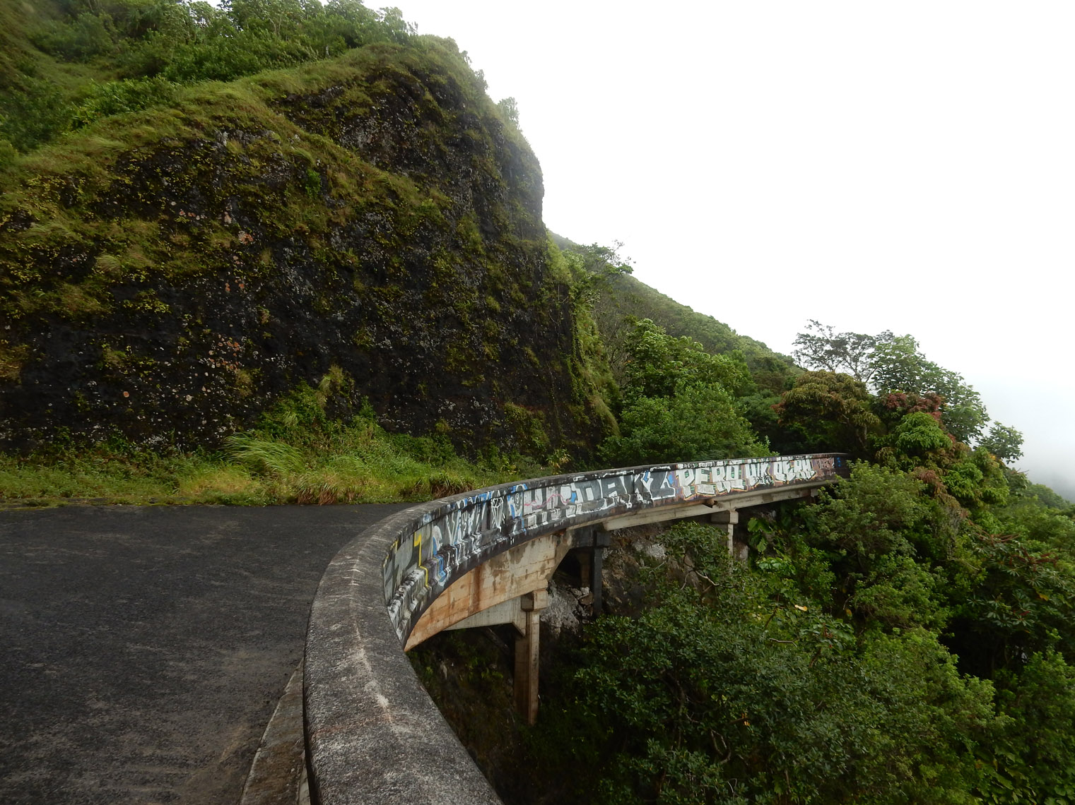 The path starts out going through the forest. It's bound to be a little muddy most of the the time, much more so when it's rainy. Kind of slippery too. After a while though, shortly after the rain stopped, we left the forest behind and ended up on the old Pali Highway. Since being replaced by the newer and wider Pali Highway, it's been closed to traffic and is slowly fading away into the forest, but it's easy to follow and walk on. Speaking of the new Pali, the trail eventually goes underneath it then continues on the old Pali along the side of the mountains and up to the Pali Lookout.