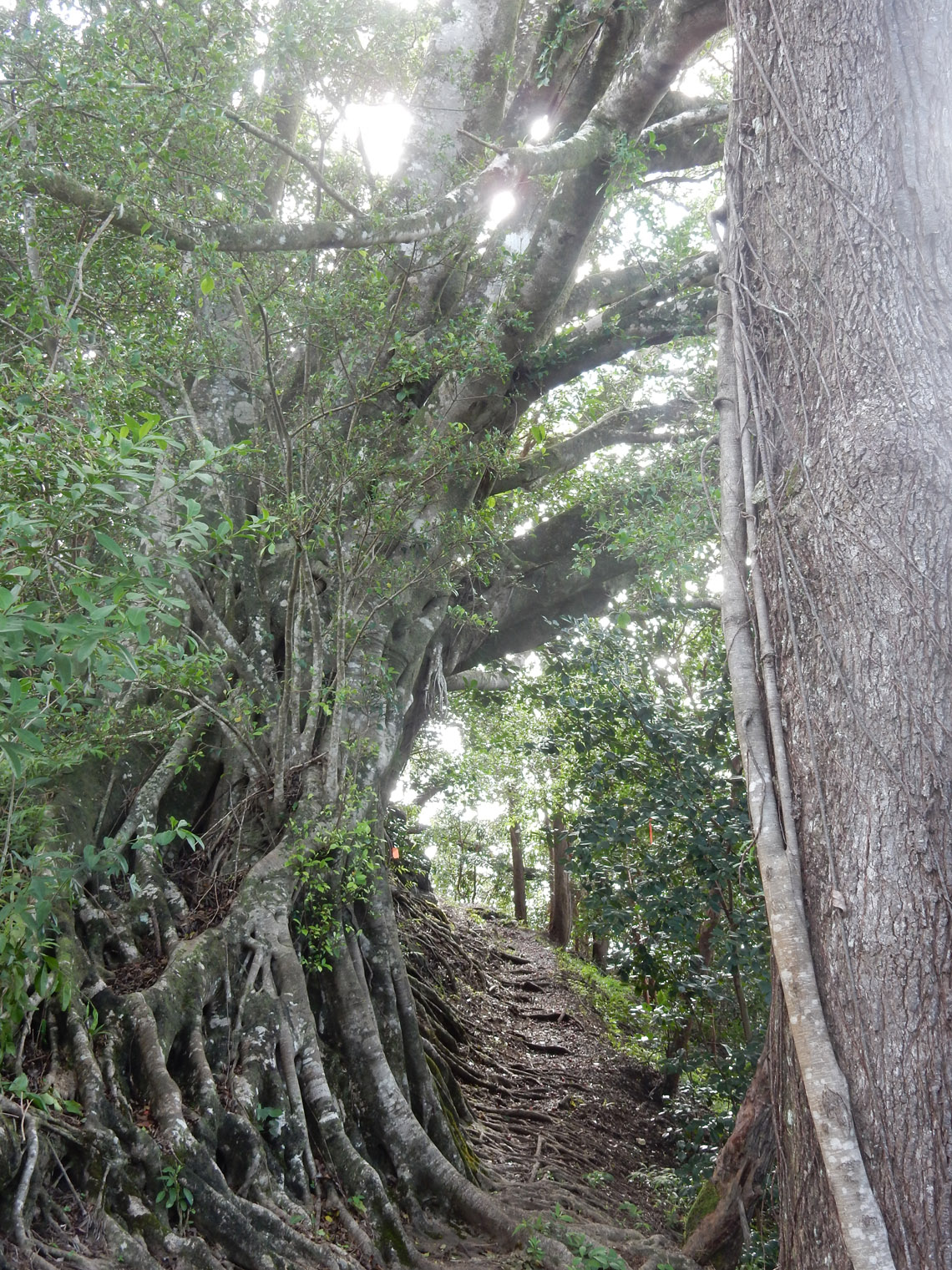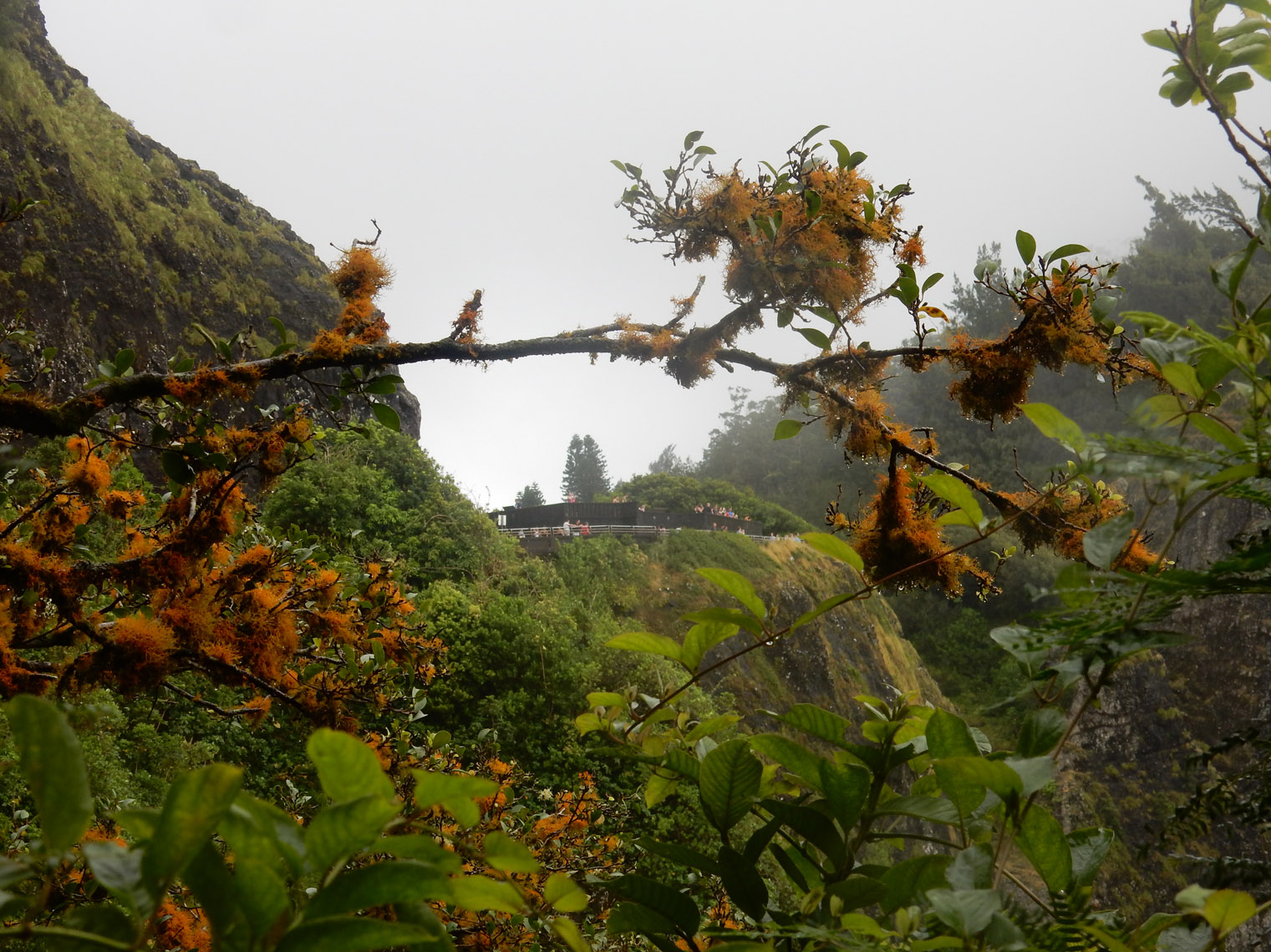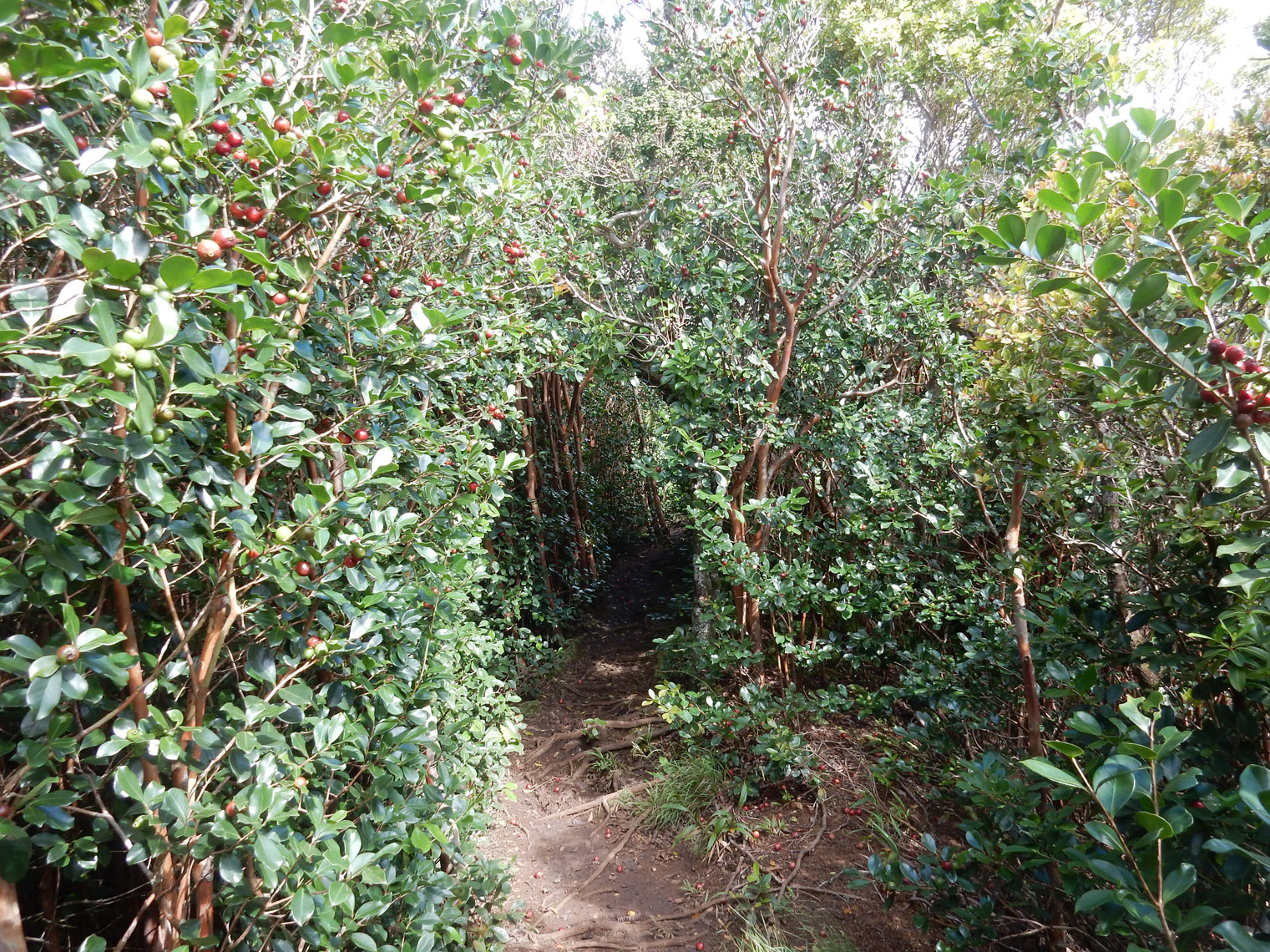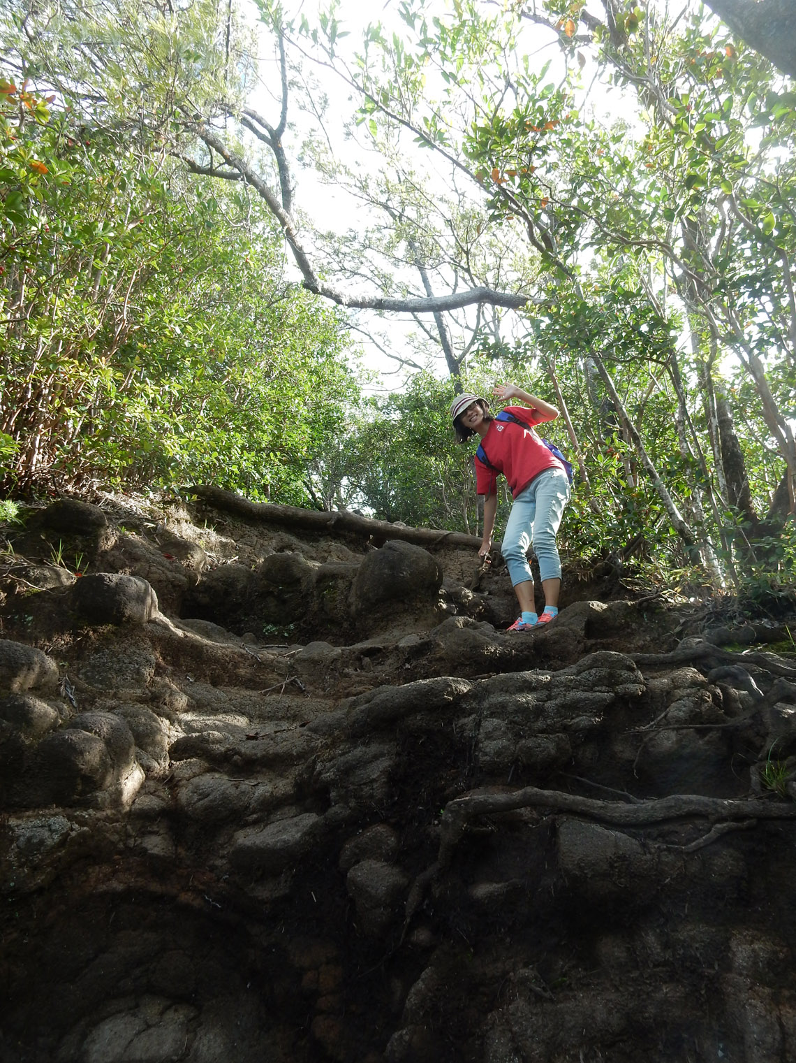 The path starts out going through the forest. It's bound to be a little muddy most of the the time, much more so when it's rainy. Kind of slippery too. After a while though, shortly after the rain stopped, we left the forest behind and ended up on the old Pali Highway. Since being replaced by the newer and wider Pali Highway, it's been closed to traffic and is slowly fading away into the forest, but it's easy to follow and walk on. Speaking of the new Pali, the trail eventually goes underneath it then continues on the old Pali along the side of the mountains and up to the Pali Lookout.
