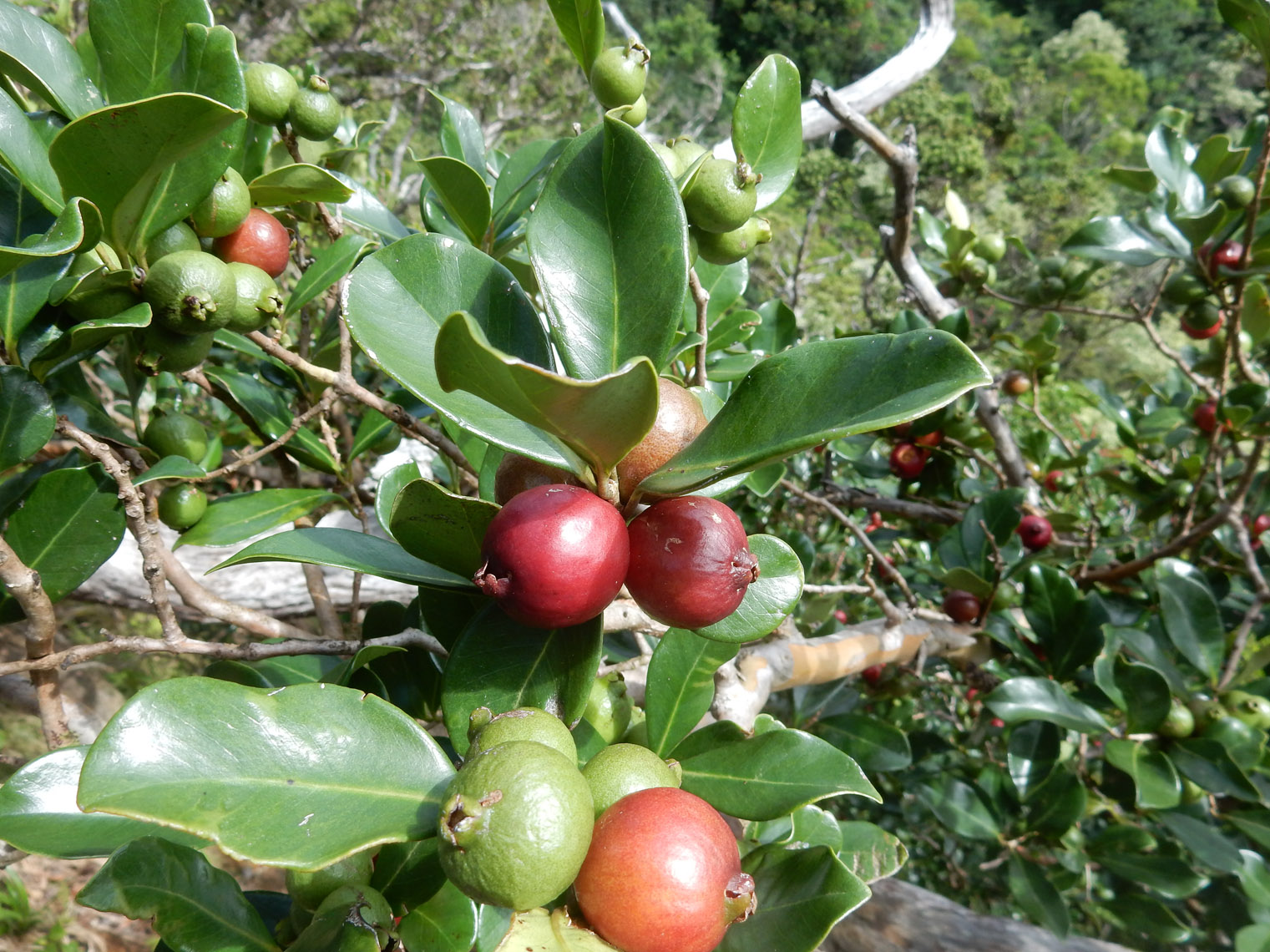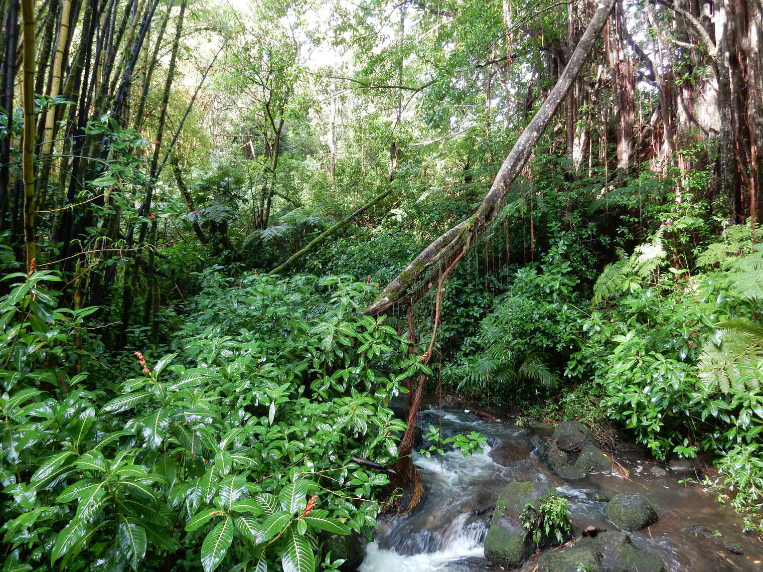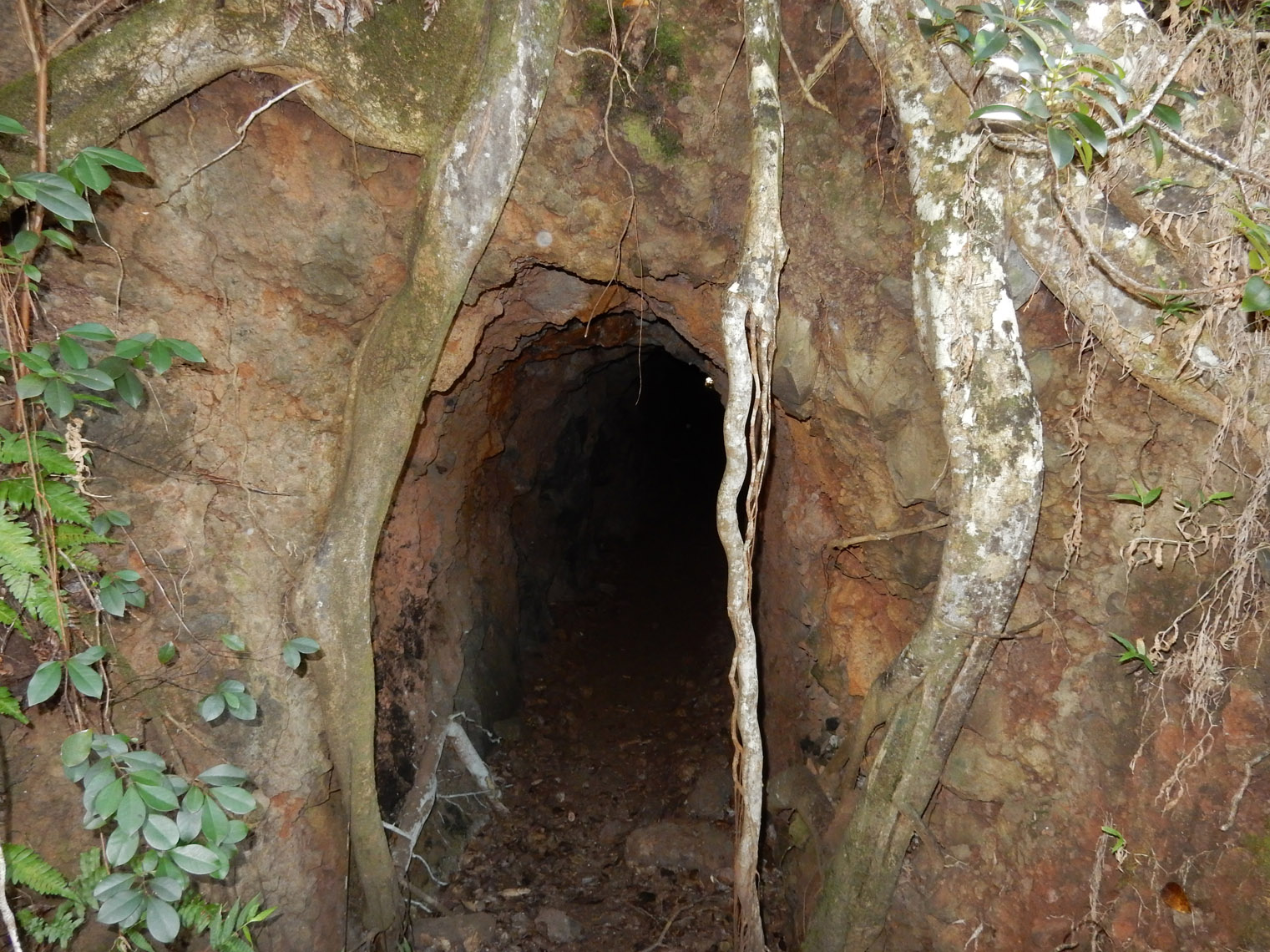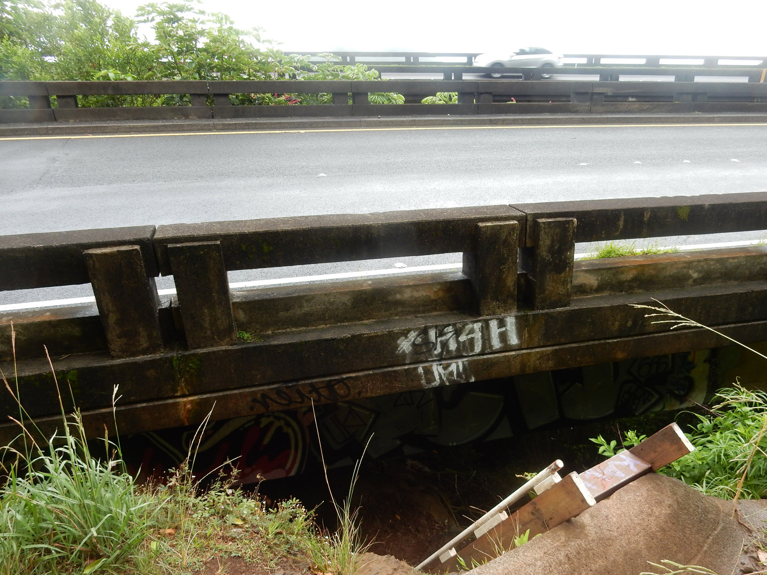 The path starts out going through the forest. It's bound to be a little muddy most of the the time, much more so when it's rainy. Kind of slippery too. After a while though, shortly after the rain stopped, we left the forest behind and ended up on the old Pali Highway. Since being replaced by the newer and wider Pali Highway, it's been closed to traffic and is slowly fading away into the forest, but it's easy to follow and walk on. Speaking of the new Pali, the trail eventually goes underneath it then continues on the old Pali along the side of the mountains and up to the Pali Lookout.
