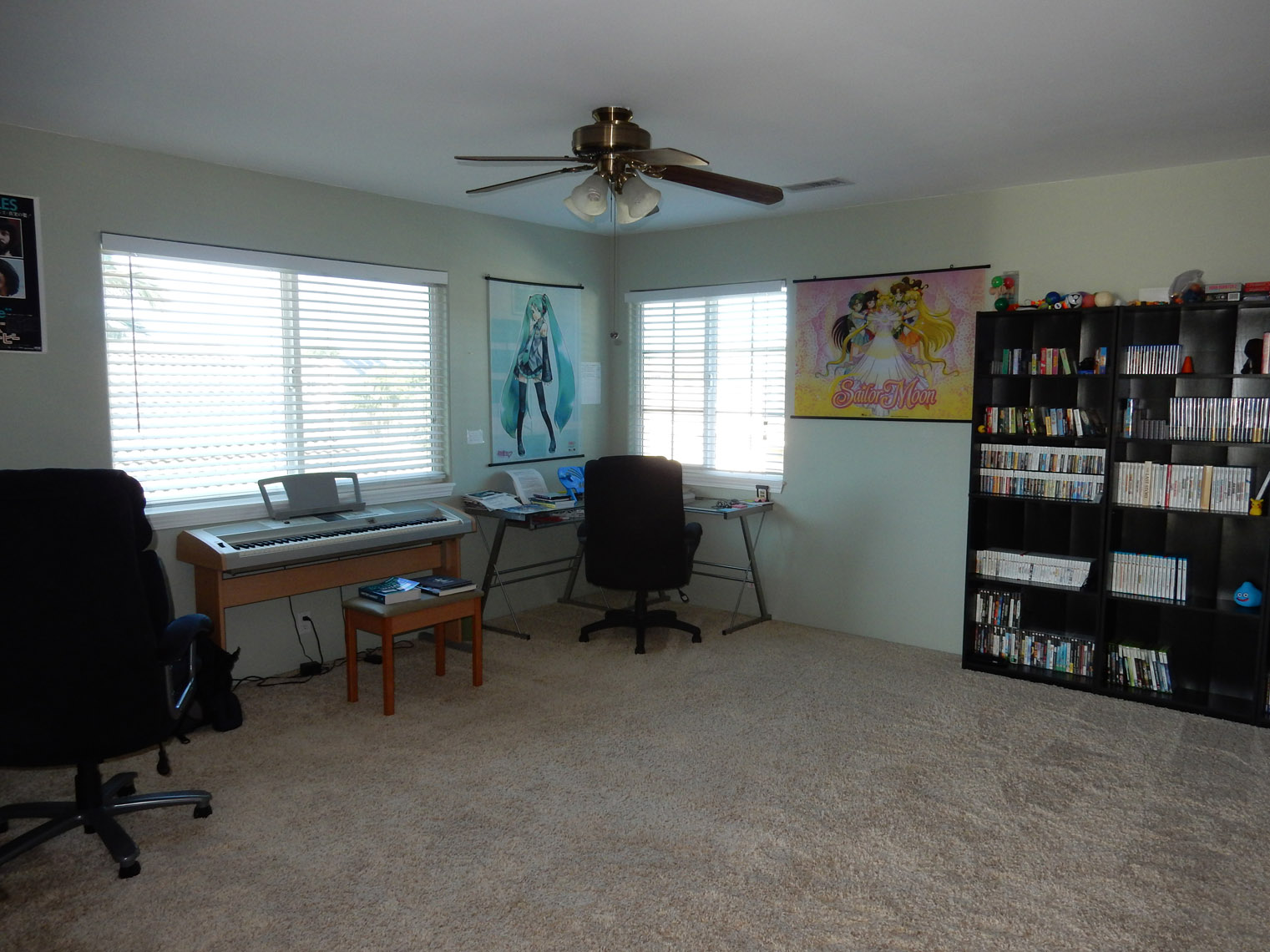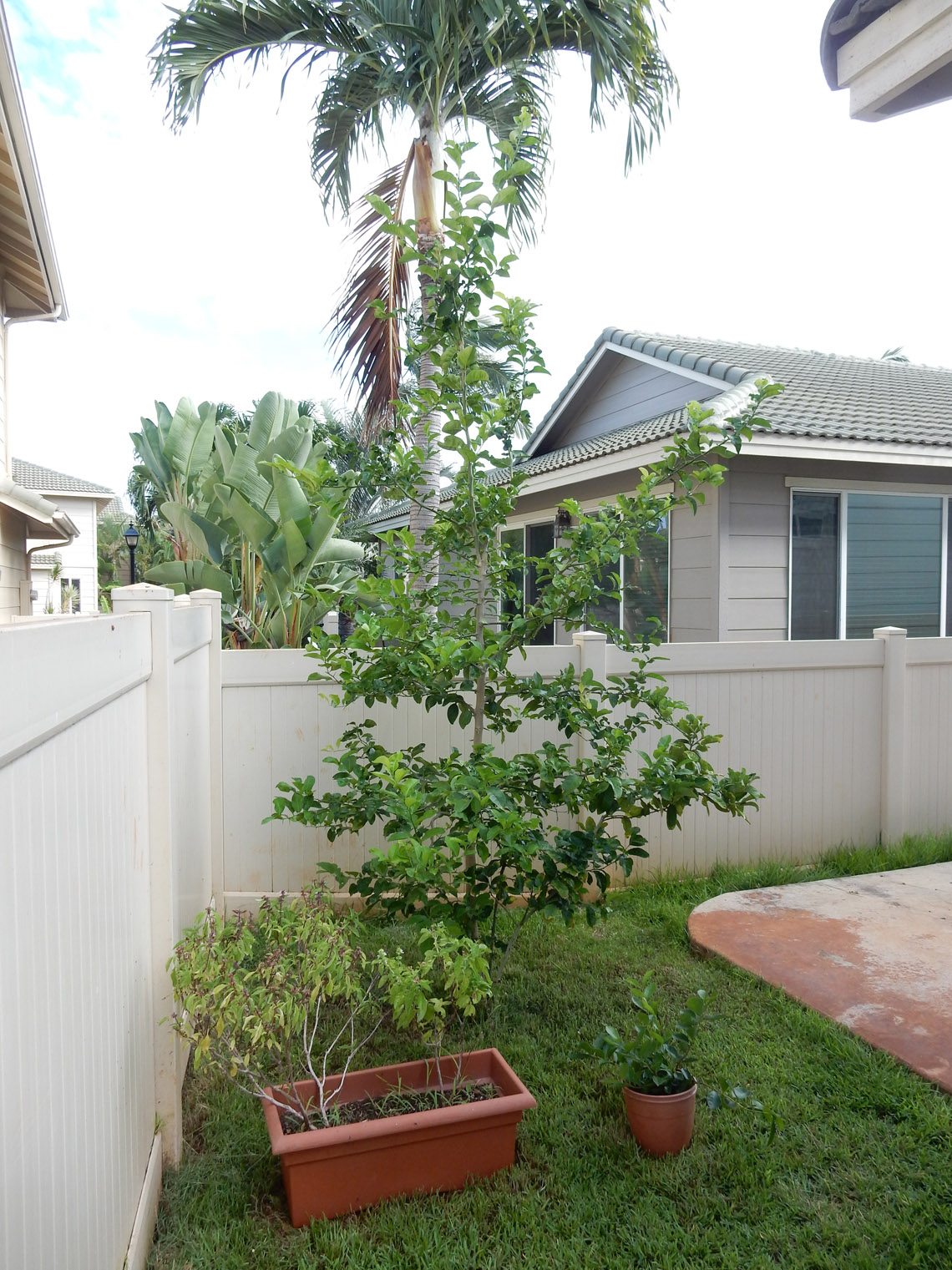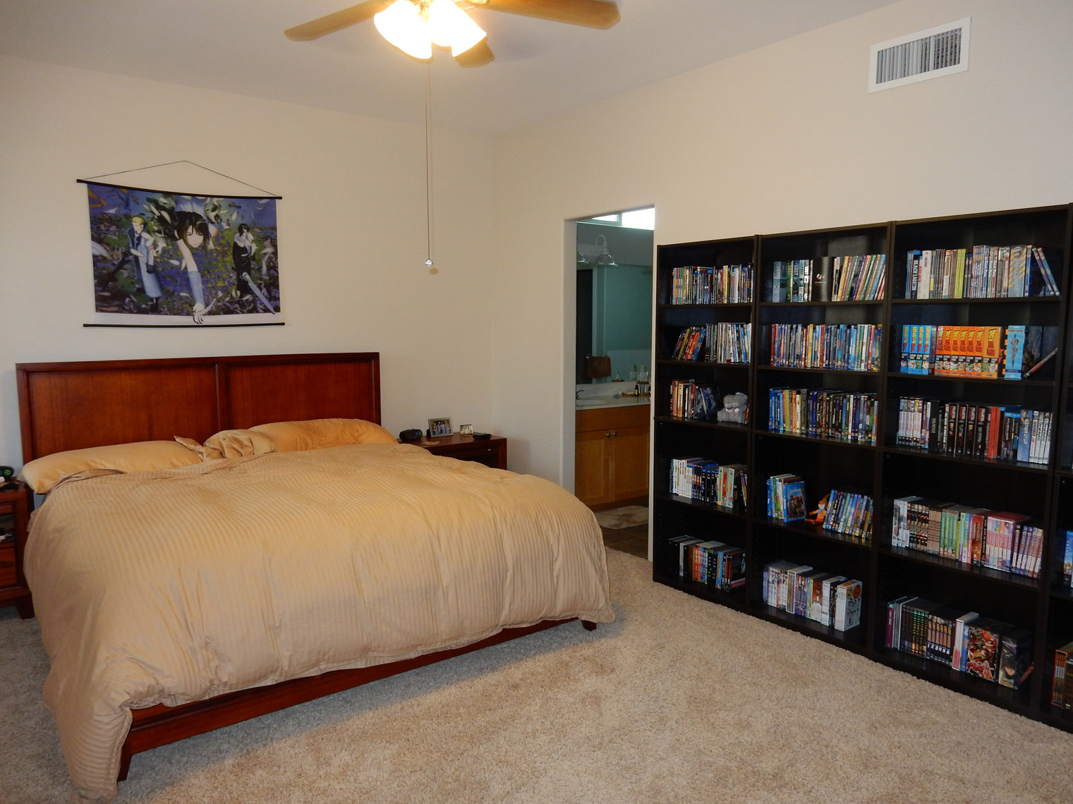 While there isn't too much of a front yard, it had a patch of birds of paradise, which are one of my favorite flowers. The guest room was right inside. Connie and I had both hoped to have a bunch of our friends visit, but that unfortunately never really happened. Just wasn't enough time, I guess. Moving on, we have the kitchen. I really liked the kitchen. I love to cook, when I have time, and having all the drawers, cabinets, and counter space was awesome. The dining room and living room were nice too. All the windows were great, though it left less room on the wall for pictures. At least I get to keep the furniture. Anyway, moving on, here's the master bedroom. Had a large attached bathroom and closest too. Once Connie and I got married, I'd intended to get a dresser to complete things, but had to put it on hold since we would likely be moving. Upstairs had a large room which I set up as an office, complete with all my figurines. Had I known that I wouldn't even have the house for two years, I probably wouldn't have spent so much time arranging them all... I had intended to eventually turn the other half of the room into a lounge of sort, moving up the TV from downstairs (after getting a bigger one for the living room), hooking up my older game consoles, and putting in some recliners or beanbags or something, but I never really had the chance... Then there's the third bedroom, which I turned in a library (a room I always wanted). There was a decent bit of empty space in there too, which I had been thinking of turning into a sitting area, extra bedroom, or maybe a LEGO area. And, finally, we have the back yard. The plumeria tree was there from the beginning, but I added the dwarf coconut and the papaya and lilikoi in this photo. Then there's my Buddha's hand, the first thing I planted in the back yard not too long after I moved in. It was only a couple of feet tall at the start, but it really took off. Got a few flowers too, though unfortunately I all my trees were too young to get any fruit yet.