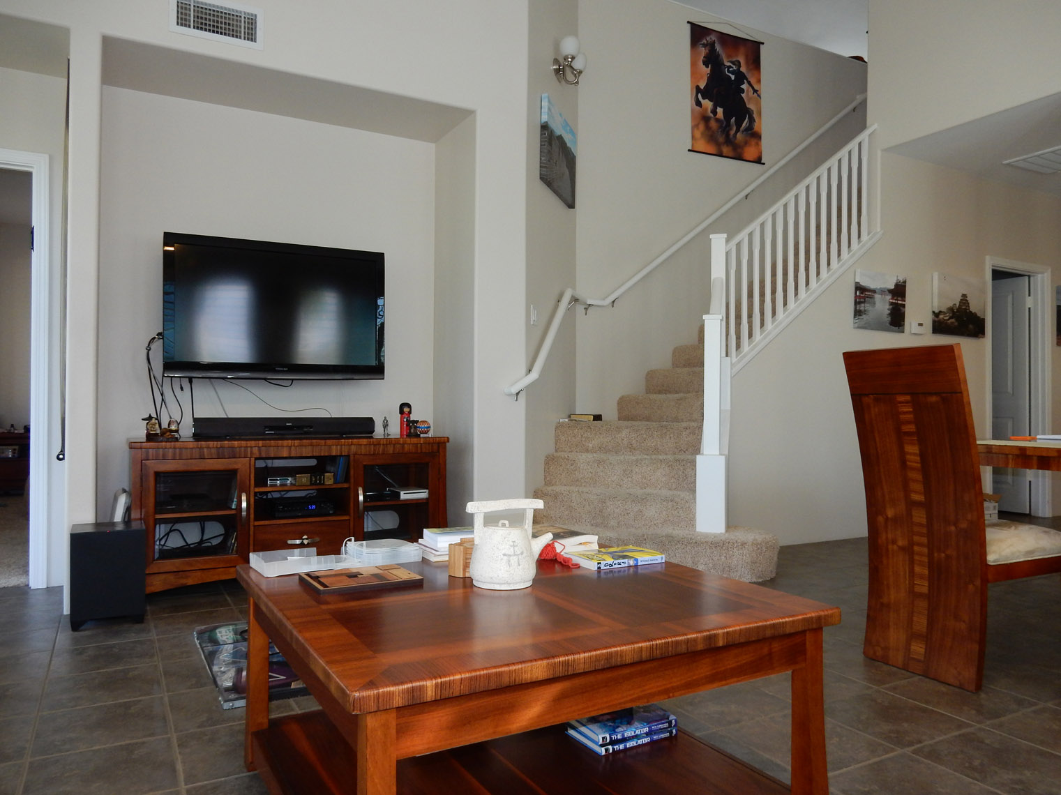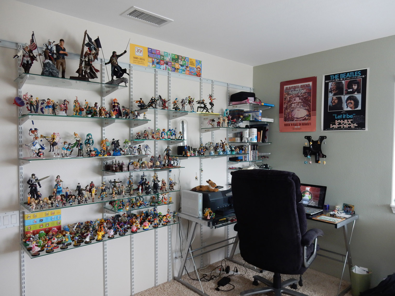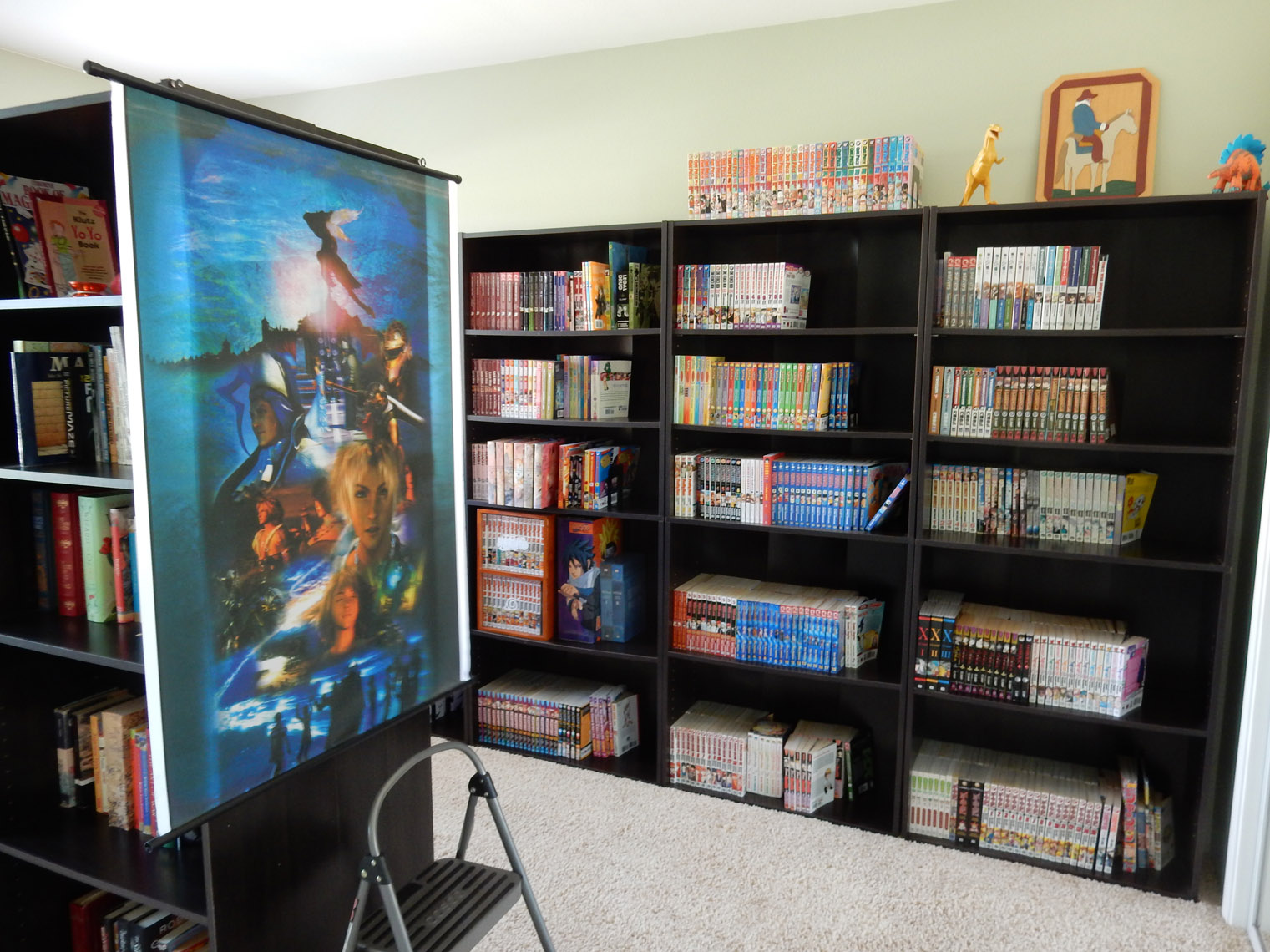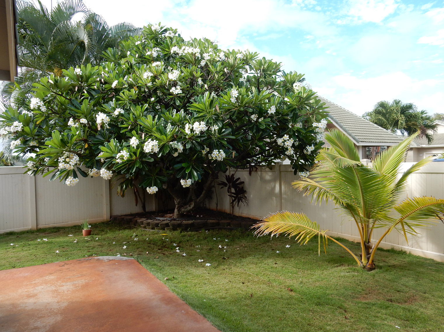 While there isn't too much of a front yard, it had a patch of birds of paradise, which are one of my favorite flowers. The guest room was right inside. Connie and I had both hoped to have a bunch of our friends visit, but that unfortunately never really happened. Just wasn't enough time, I guess. Moving on, we have the kitchen. I really liked the kitchen. I love to cook, when I have time, and having all the drawers, cabinets, and counter space was awesome. The dining room and living room were nice too. All the windows were great, though it left less room on the wall for pictures. At least I get to keep the furniture. Anyway, moving on, here's the master bedroom. Had a large attached bathroom and closest too. Once Connie and I got married, I'd intended to get a dresser to complete things, but had to put it on hold since we would likely be moving. Upstairs had a large room which I set up as an office, complete with all my figurines. Had I known that I wouldn't even have the house for two years, I probably wouldn't have spent so much time arranging them all... I had intended to eventually turn the other half of the room into a lounge of sort, moving up the TV from downstairs (after getting a bigger one for the living room), hooking up my older game consoles, and putting in some recliners or beanbags or something, but I never really had the chance... Then there's the third bedroom, which I turned in a library (a room I always wanted). There was a decent bit of empty space in there too, which I had been thinking of turning into a sitting area, extra bedroom, or maybe a LEGO area. And, finally, we have the back yard. The plumeria tree was there from the beginning, but I added the dwarf coconut and the papaya and lilikoi in this photo. Then there's my Buddha's hand, the first thing I planted in the back yard not too long after I moved in. It was only a couple of feet tall at the start, but it really took off. Got a few flowers too, though unfortunately I all my trees were too young to get any fruit yet.