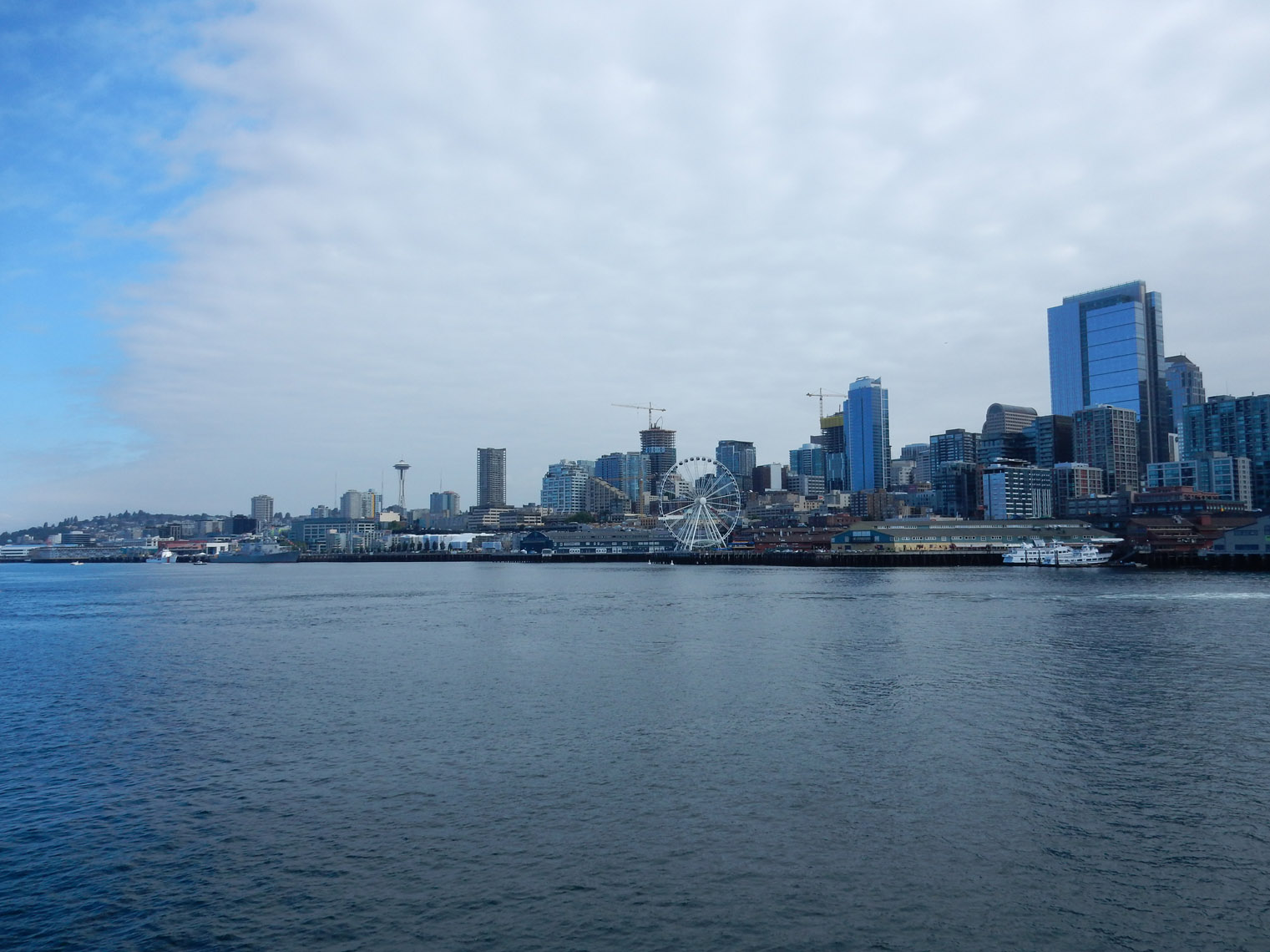 My family isn't in Seattle itself, but a smaller town nearby. We could have driving into Seattle but there's a toll bridge and, like most big cities, parking can be a pain, so we took the ferry. Plus, there's the view and everything. Interesting note, taking the ferry into Seattle is free, they only charge when you take the ferry out of Seattle. A little odd, but I guess they figure that if you go one way you'll probably go the other as well, and it saves them the trouble of hiring ticket takers on both sides. It was kind of cold and cloudy at the start, but the sun began to come out by the time we drew close to Seattle itself.