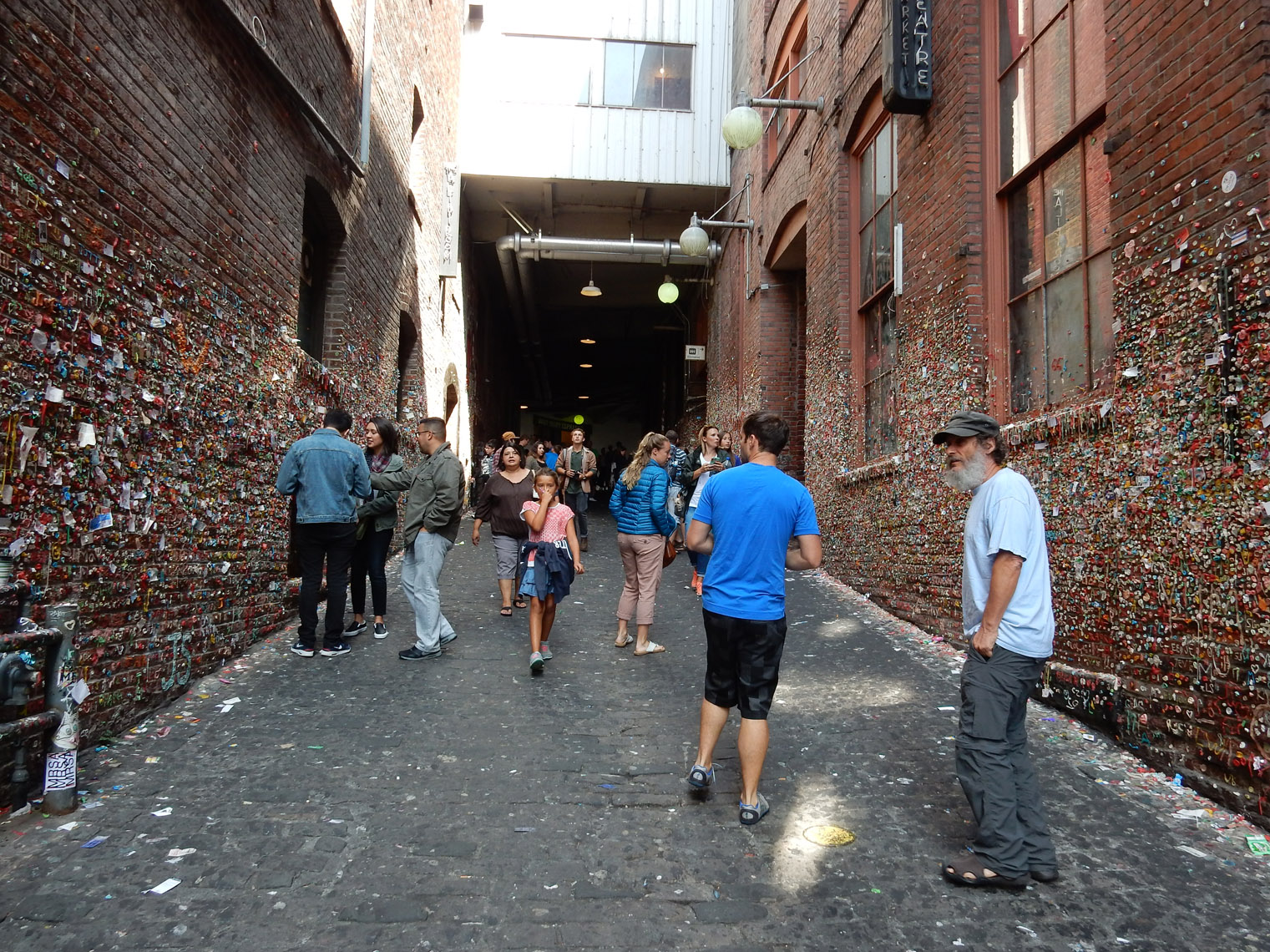 When we disembarked, we happened to see a policeman training a dog to sniff out bombs or drugs or something. At least I think it was training. Not sure why they were doing it at the ferry terminal, but it was kind of interesting to see. Anyway, Noah (my brother) and Hannah (his wife) had a loose itinerary planned so we headed off. From walking around, Seattle seems like a fairly nice city. Clean, neat, and somewhat hilly (though nothing like San Francisco in that regard). Out first stop was the gum wall. Yes, you heard that right. It's a wall where people stick gum. Well, actually, it's not one wall but an entire alley. Not exactly my choice of attractions but it was kind of fascinating, though disgusting at the same time. The whole place even smelled like gum...