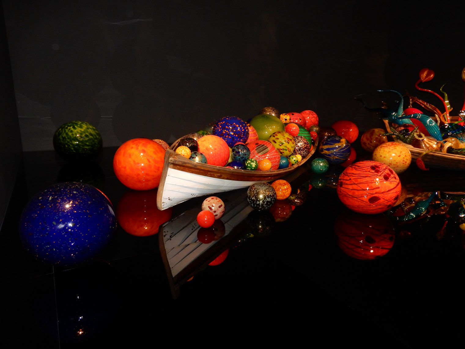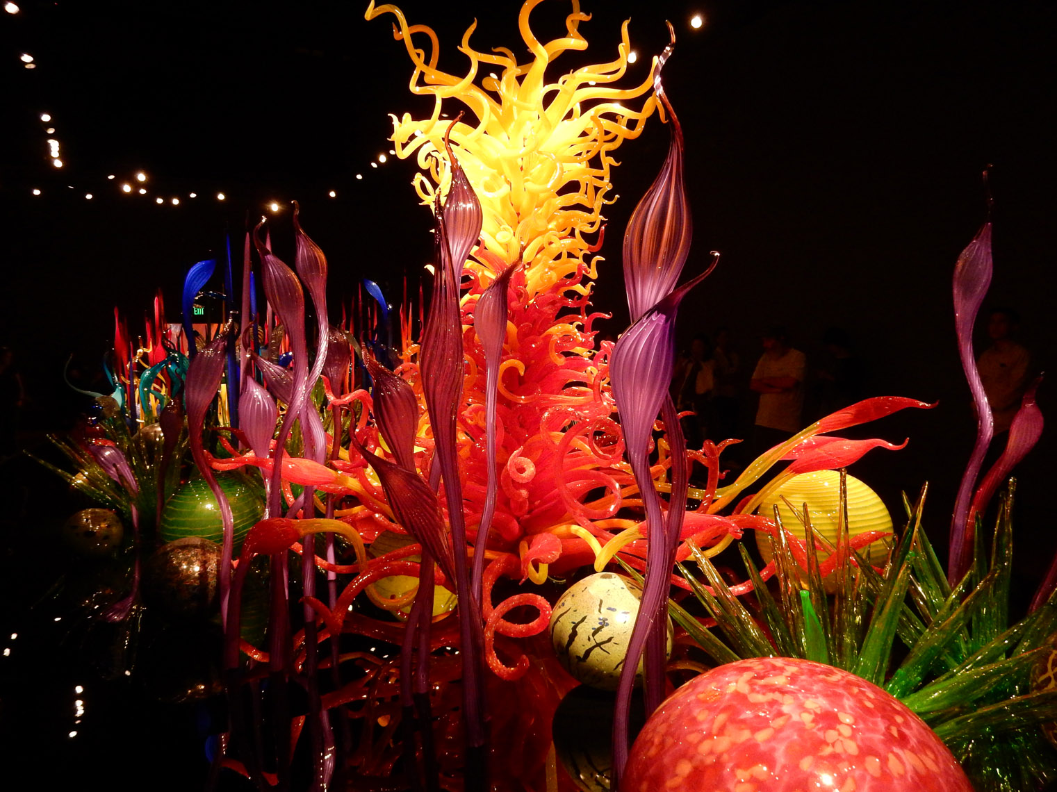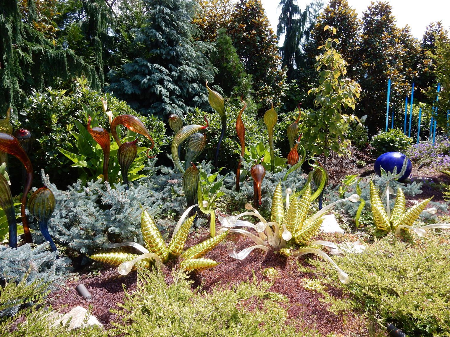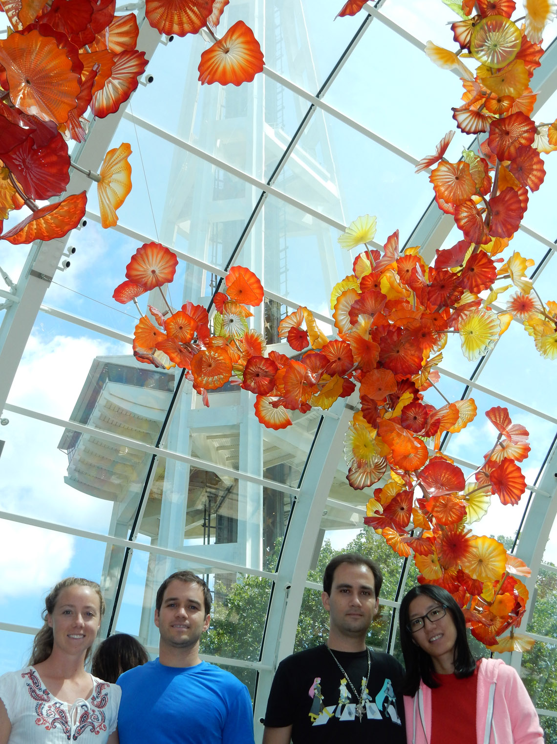 After leaving the market area, we made our way towards the Space Needle. It's actually not as tall as I would have thought, and is somewhat dwarfed by Seattle's less iconic skyscrapers. In the end, we decided not to go up to the top and went to the nearby Chihuly Museum instead. If you're not familiar with Chihuly, he's an artist whose primary focus is glasswork, a lot of which is very large, colorful, and detailed. The museum starts out with a series of rooms, each dedicated to a particular piece or theme, before opening up into a large glass chamber and, finally, a flower garden with glasswork interspersed. I've seen Chihuly's work several times before, at various locations, and it's always impressive and beautiful, if sometimes a bit weird. While the museum isn't huge, it has a large variety of interesting pieces and we enjoyed slowly making our way through.