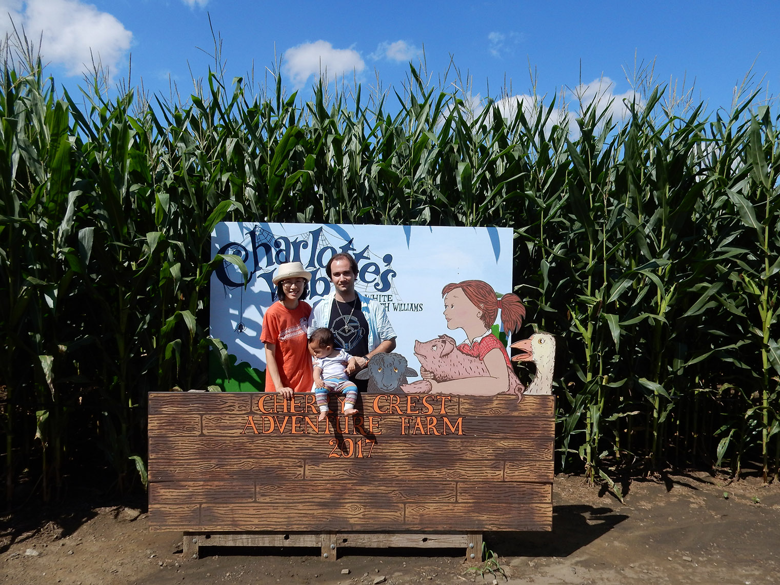 This year, the theme was Charlotte's Web. Since we came a bit earlier than last year, the corn was still nice and green and, as always, lots of fun to walk through. This was one of my slower maze completion times, but pushing Zack's stroller along the paths, while not especially difficult, did reduce our pace a bit. We also got turned around once after stopping for a while to feed him, which led to us accidentally backtracking into a section of the maze we'd already explored pretty thoroughly, completely missing the turn we needed to enter the final stretch. But it was fun and Zack did pretty well. I'm looking forward to taking him when he's a bit older and can appreciate both the maze and all the other games and activities they have set up around the farm.