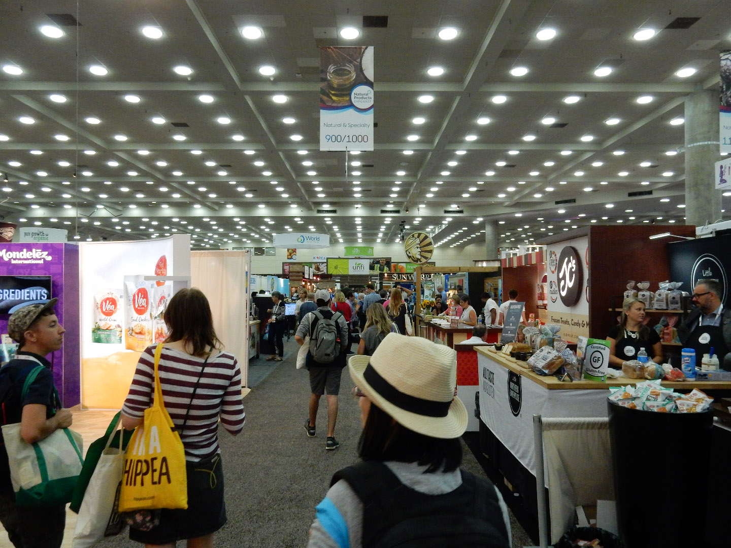 Backstory aside, while the expo lasted for several days, we only had time to go on Friday. But I'd say one day is good for seeing the expo floor. I've been to various expos before, but this is the first natural products one. The first (very large) half of the show floor was devoted to food. A lot of the major brands you'll see in a health food store had booths, along with a lot I'd never heard of before. Of course, they all had the usual expo stuff. Product fliers, pens, clips, and other branded junk (well, mostly junk; I did pick up a nice mug, several good canvas bags, and a fidget spinner). But they also had lots and lots of samples. Chocolate, coffee, and tea seemed to be the most common, but that was only the beginning. Dried fruit, energy bars, candy, milk, cheese, sodas, juice, crackers, popcorn, jerky, ice cream, etc., etc., etc. Most of it was meant to eat there, and Connie and I had a lot of fun wandering around and snacking on whatever looked interesting. But we also filled a fairly large bag each with samples to take home.