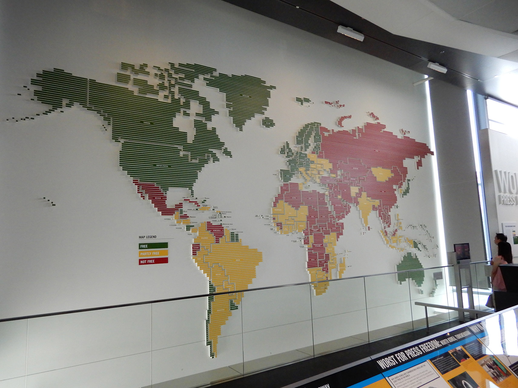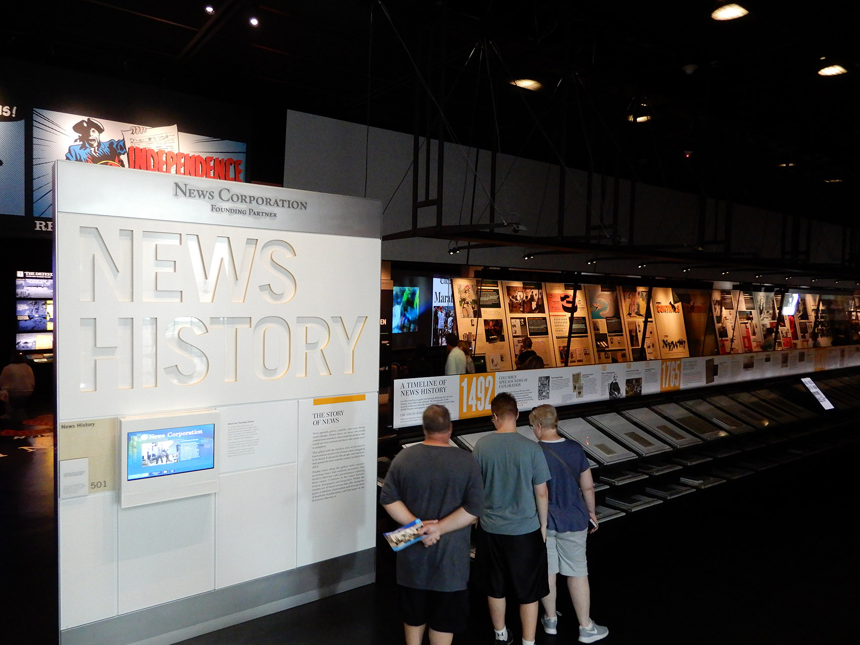 Most of the Museums in DC are part of the Smithsonian and, as such, always free. But DC has its share of private museums as well and one of the most popular is the Newseum. In case the name didn't clue you in, it's about the news. Specifically, the history of the news and some especially newsworthy events throughout history. Following the recommended route I started in the basement, watched an intro video, and then took a look at an exhibit about the Berlin Wall, complete with an actual section of the wall. I remember studying about it in history class, of course, but I had forgotten that it really didn't fall all that long ago. Next up was a really interesting exhibit about the FBI, including details about some of their most famous cases and the ways they're adapting to deal with terrorism, cyber attacks, and other modern threats. There was also a small exhibit about newspaper comics. I ended up right near the cafeteria and I hadn't eaten much, so I decided to grab an early lunch before continuing on. Not bad, though there are certainly better places to eat in the area. Anyway, from there I took an elevator to the top floor which featured a nice view of Pennsylvania Avenue, a collection of award winning photos, and a set of current front pages from newspapers from all 50 states and a few different countries. It was kinda of interesting to see how the tone varied between them, even when reporting on the same stories. The next floor was focused on the history of news reporting in the US, from the early days of the country up through modern times, along with a collection of newspapers and the like from the entire period. One thing I appreciated was how balanced it was, pointing out some of the news media's greatest triumphs and biggest mistakes. That applied to the rest of the museum as well...mostly. All the info in the exhibits was very fair and balanced...up until you got to things from the last five or ten years (and especially the last two) and which point the information presented all had a very clear political slant to it. That was annoying, but at least it was only a very small part of the museum. Anyway, other notable exhibits included one on the history of different media used to report the news (radio, TV, and the internet), a section on journalistic freedom around the world, and a section where you could do a faux news report on a greenscreen, to name a few. In the end, it took me about four hours to do a pretty thorough tour of the museum (though I didn't watch all the videos). I can see why the Newseum is popular. It has a number of fascinating (and mostly fair and balanced) exhibits. It's not really good for kids, or anyone who doesn't want to read a lot (though there are a bunch of photos and videos as well), but if you don't mind spending some money to go to a museum in DC, it's certainly worth a look.
