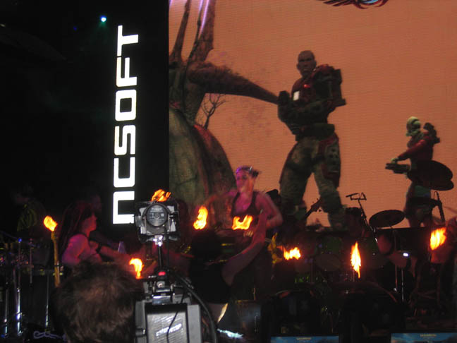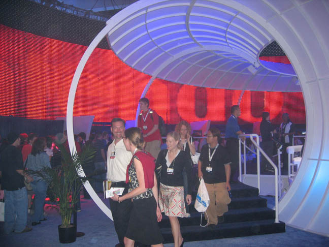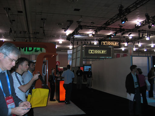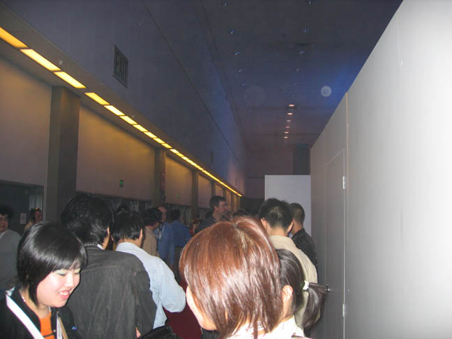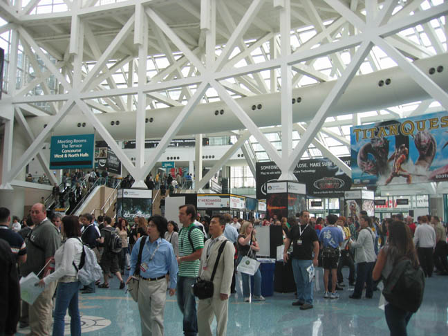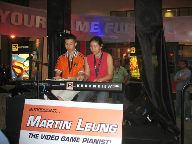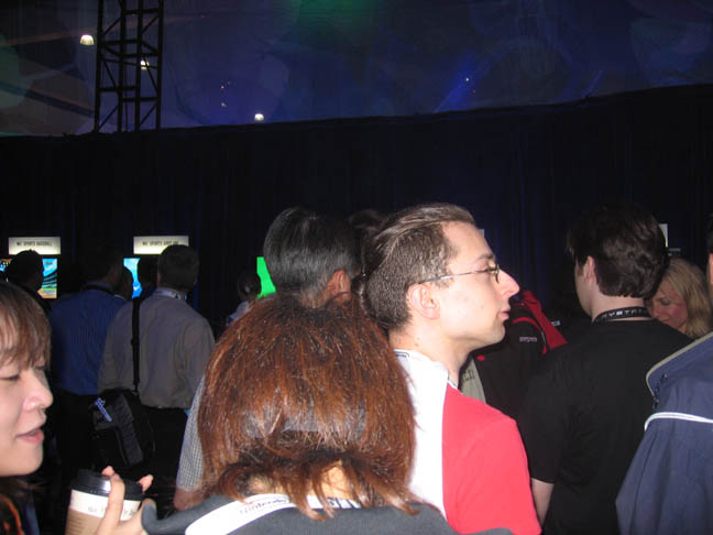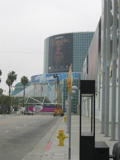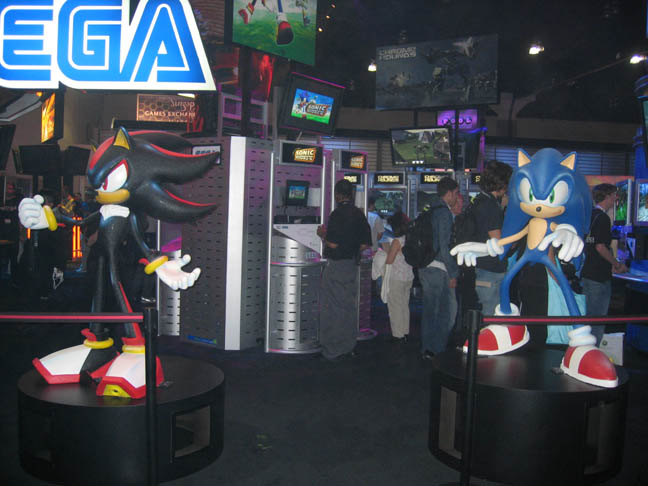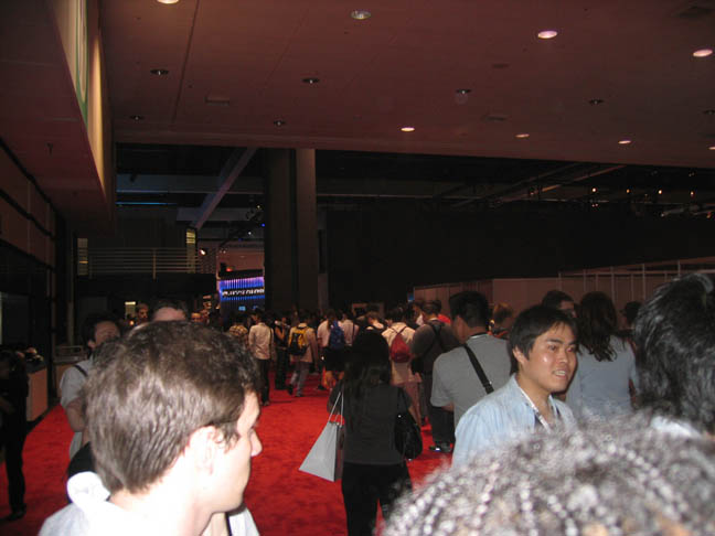 Ah, mid May and it's already over 100 degrees. Gotta love that Phoenix weather! Or not... Anyway, the new ROM is up and this is also the perfect time to vote and check out friday's bonus comic. As promised, I'll be talking about my E3 trip this week. Today will be about the trip and show while wednesday and likely friday as well will be about the games and systems I saw there. Ok, so my trip started last monday. Wanting to avoid what happened last year (where I missed the entire last day because of my plane ticket), my friend David and I decided to drive this year. Also, since we got the Super Pass this year instead of just the Expo Pass, we were able to get into all the pre show sessions on tuesday. So David and I left right after we got out of school monday afternoon. Despite my offer to split the driving, David wanted to drive most of the time so we spent around 6 1/2 hours chatting in the car while I played Castlevania on my GBA. Being used to long car rides, I planned ahead and was prepared with google maps and a hotel reservation for monday night (since our E3 hotel reservation didn't start until tuesday). We got in kinda late, went to sleep, and were up bright and early to find our new hotel and drop off our bags before heading to the LA Convention Center. Tuesday: Unfortunately, although the E3 preshow stuff started on tuesday, the E3 bus service didn't start until wednesday. Fortunately we did have a car, unfortunately that also meant we had to pay for parking... Looks like not a whole lot of people come to the tuesday sessions. After last year, it was weird seeing the building so quiet. Not that I'm complaining, it sure beat waiting in line for an hour to get my badge holder (which I had to do last year). It also provided a nice oppertunity to watch this Gears of War drawing being made. Anyway, since the expo floor wasn't open, tuesday was all about the sessions (there were keynotes too but those were held off site and only let certain people in). There were three going in every given time slot so you had to pick and choose. Unfortuately, it turned out that my choice for the first slot wasn't about what I'd thought it was and ended up being kinda boring. Fortunately, the rest of the day went much better. I got to see Will Wright discuss Spore, hear some top industry professionals discuss the changes the new game consoles will have on game design, and got some great tips on pitching game designs to publishers. Very interesting... After all the sessions were finished David and I headed back to the hotel to find that the rest of the students from our school had arrived a few years ago but had been stuck at the hotel and missed the sessions. Glad I drove. Wednesday: Now this is what I was waiting for! Got up early, caught the first bus, and, after getting stuck in traffic for a while, made it to the convention center. Ah, there's the crowds. Despite E3's efforts to reduce attendence, there were around 60,000 people there this year. Dissapointingly, the main expo floors opened late that day for everyone without an exibitor or early media badge so I checked out some others areas such as Kentia Hall (the third, smallest, and least impressive show floor) which wasn't all that interesting except for Red Octane's booth were I got to play Guitar Hero II. I also took a very brief look in Midway's room (not a big fan of their games) and browsed the game art exhibit where they had this neat Kirby painting. Finally the main expo halls opened. Like last year, there were lots of fancy booths, signs, lights, and the like. My first stop was Square-Enix's booth. I missed their show last year because you had to go early and get tickets first thing if you wanted in. This time I got my ticket. Had some time to kill before the show so I wondered around a bit and checked out Sega's booth. Square's presentation took place in a closed theater and unfortunately photos weren't allowed. It started out pretty predictable. Final Fantasy XII, FFVII Dirge of Cerberus, FFVII Crisis Core, FFVII Before Crisis, etc. There was also a very brief mention of their Nintendo Wii launch title (Dragon Quest Swords). The real surprise was Final Fantasy XIII (yes, XIII!!!) for the PS3. You can probably find the trailer on-line know but it involved a girl with a gunblade style weapon fighting off lots of soldiers on a train in a very sci-fi style setting. Most of the trailer was CG movies but there was some gameplay footage as well. The graphics were amazing. Looks like they're going with a more action based battle system too. Fortunately, they've got a great team working on it. There will be two other FFXIII game as well (although the relation is unclear). FF Versus XIII is also PS3. No gameplay for that one but it showed a guy with a whole lot of floating weapons going up against an entire army. Then there's Angito XIII, a cellphone game that they didn't say a whole lot about. After the show I was able to get a picture of this action figure of the girl from FFXIII. Also, despite some controversy, there were still lots of booth babes at the show. Did I get a picture of the FFXI ones last year too? I didn't get my picture with any booth babes this year, although it was kinda fun seeing my family's reaction to last year's pic. Anyway, there was a session that afternoon showcasing Gears of War, Red Steel, and Metal Gear Solid 4. I went mainly for the last one (and the fact that Kojima was there). The new trailer was pretty amazing and hinted at some pretty interesting plot twists. After that I skimmed the rest of the show floor so I'd have an idea of what to spend more time on the following days. Naturally, Microsoft, Sony, and Nintendo had some of the biggest booths. Since the line wasn't too long I spent some time playing with the PS3 and it's new tilt sensing controller (more on that another day). They had everything on the show floor, which kept the lines pretty small. I stayed until the floor closed, got stuck in traffic a