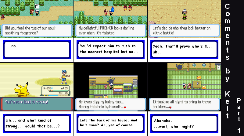 I know there was a bunch of fans who wanted the grass kid to make a return so, enjoy. Brendan and May will be returning on Friday. If you didn't know, US elections were yesterday. Also, if you didn't know, I write these posts the night before they go up (so it's Tuesday (election day) night right now). As of right now, the media has already predicted a winner. But, while I think nearly all the polls are closed as I write this, they still haven't counted something around half the votes. Admittedly, there's a decent chance the prediction is correct...but they've been wrong before, so I'm going to wait till the votes are all counted before believing anything. Personally, I really wish the media wouldn't call states until at least say...80% of the votes in that state are counted (and even then, only if it's not really close). I mean, they were calling some states when less than 10% of the votes had been counted. What's up with that? The news has made a real mess of things in the past when they've declared the winner, only to find out they were wrong once all the votes were counted. Pretty annoying if you ask me. Anyway, chances are by the time you read this they'll know for sure (unless there's a recount). But I think I'm just gonna stop here and wait and see what they say in the morning. Josiah |