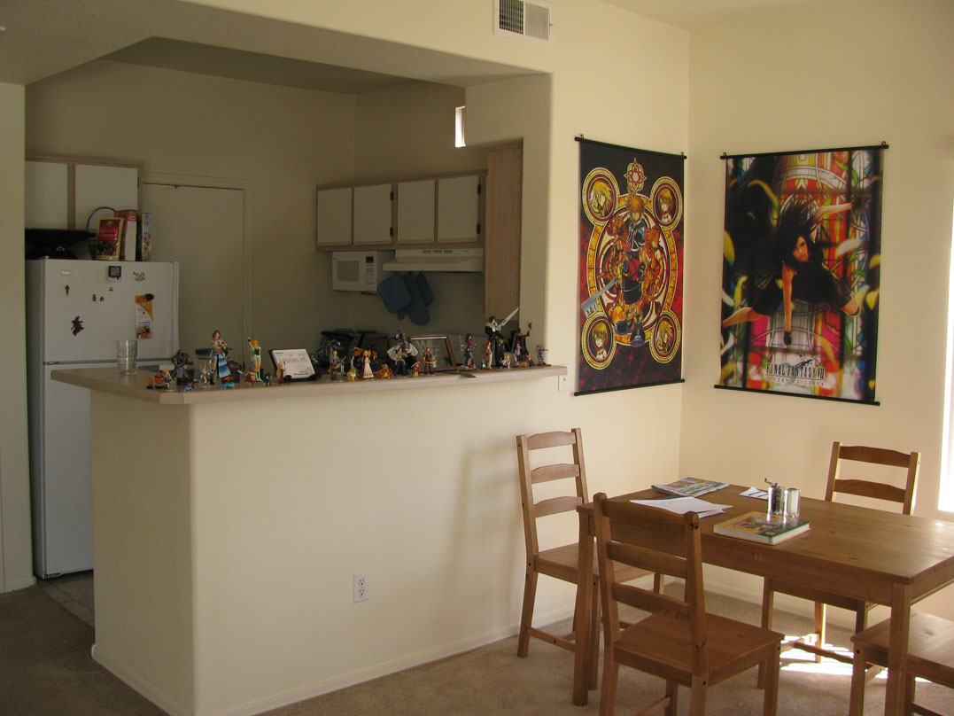 There's a new voters' bonus comic up. This is the first of a short election inspired mini series, a lot like the election strips I've done in the past, but this time there will be three of them. Moving on, Shauni isn't feeling too well so there's no ROM today. Thursday are looking to be my busiest day of the week by far, and I got back from school kinda late Thursday night so I'm going to keep this quick and just post those apartment pics I promised. First off, here's pic of all my figurines (most of which I got in Japan) before I laid them out around the apartment. Moving on, here's the living room, dining room, kitchen, and bedroom. It's a pretty nice apartment and a whole lot bigger than the one I had in Japan. Pretty good location too. It's on the second floor (I would have preferred first but it's ok) but it's off in the corner of the complex so it's pretty quiet here, which is good when you're in a complex with a lot of college students. Well, I need to get going. See you next week! Josiah |